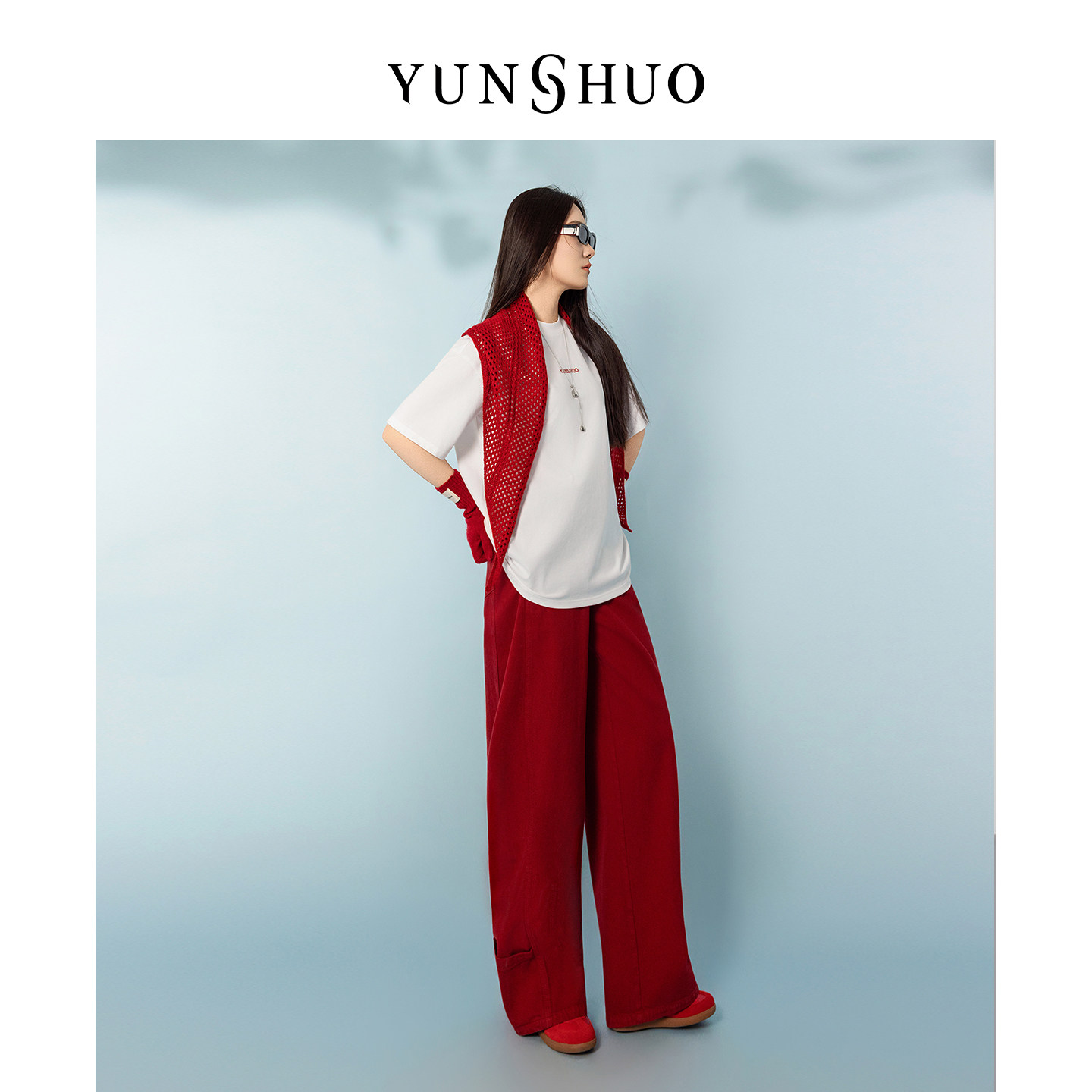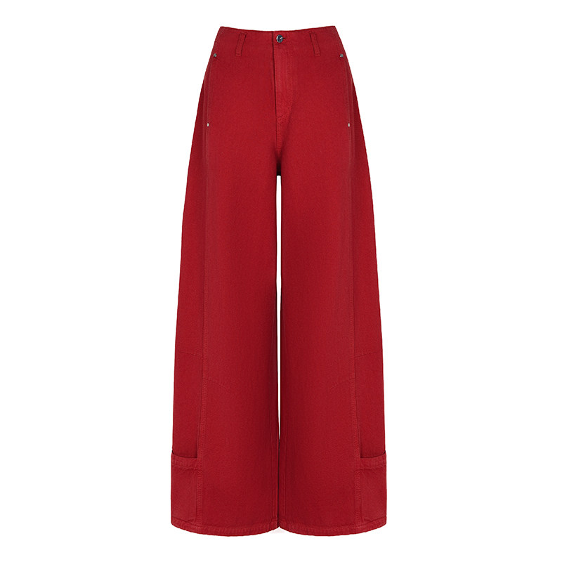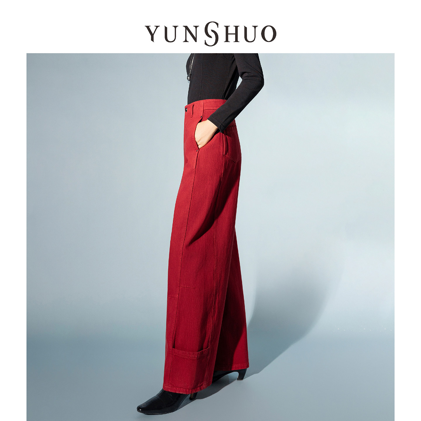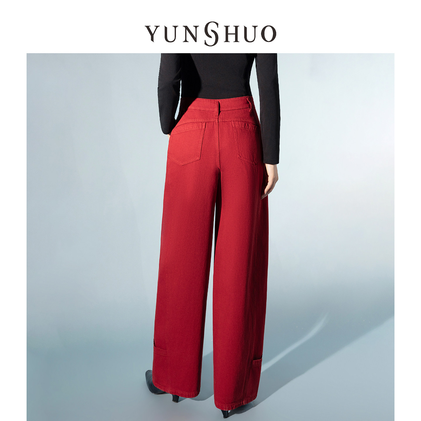 女全棉抗皱白色长裤 高腰阔腿裤 子198355 红色弯刀牛仔裤 允硕新品