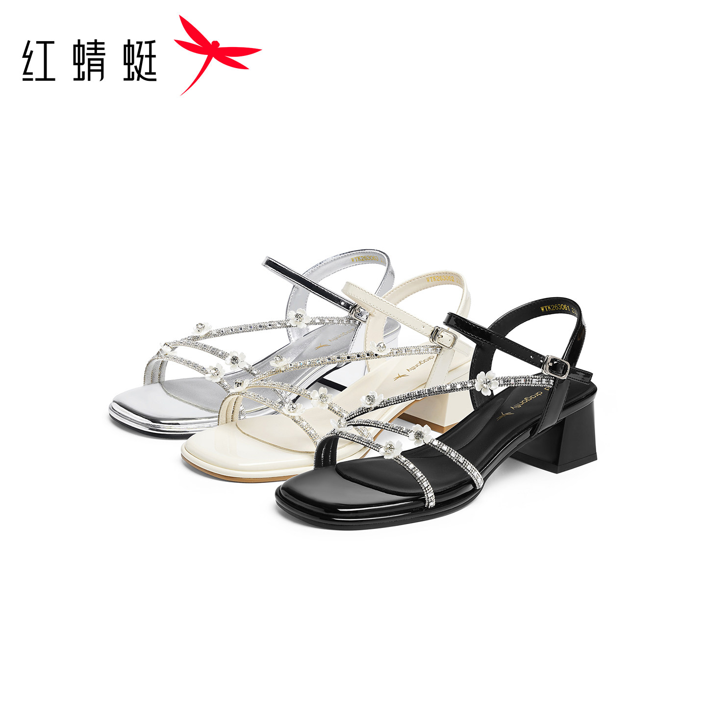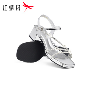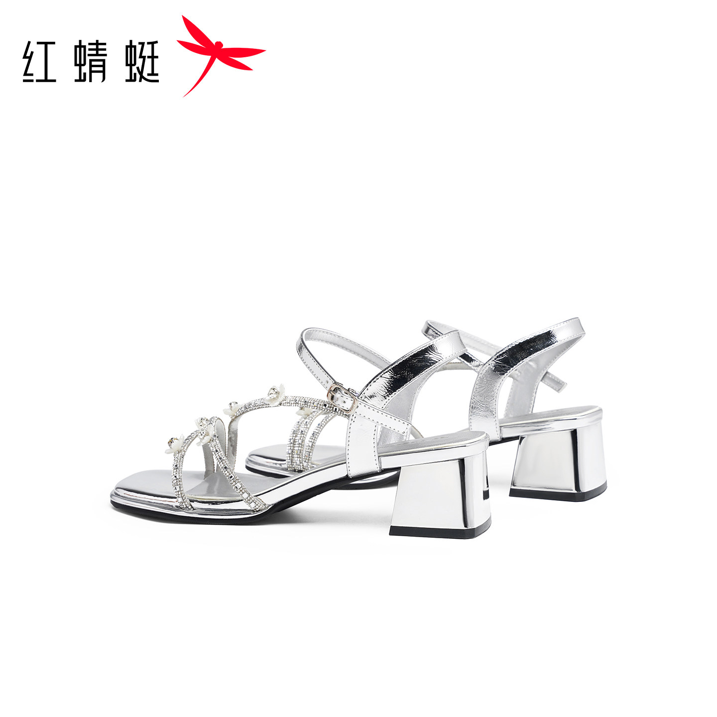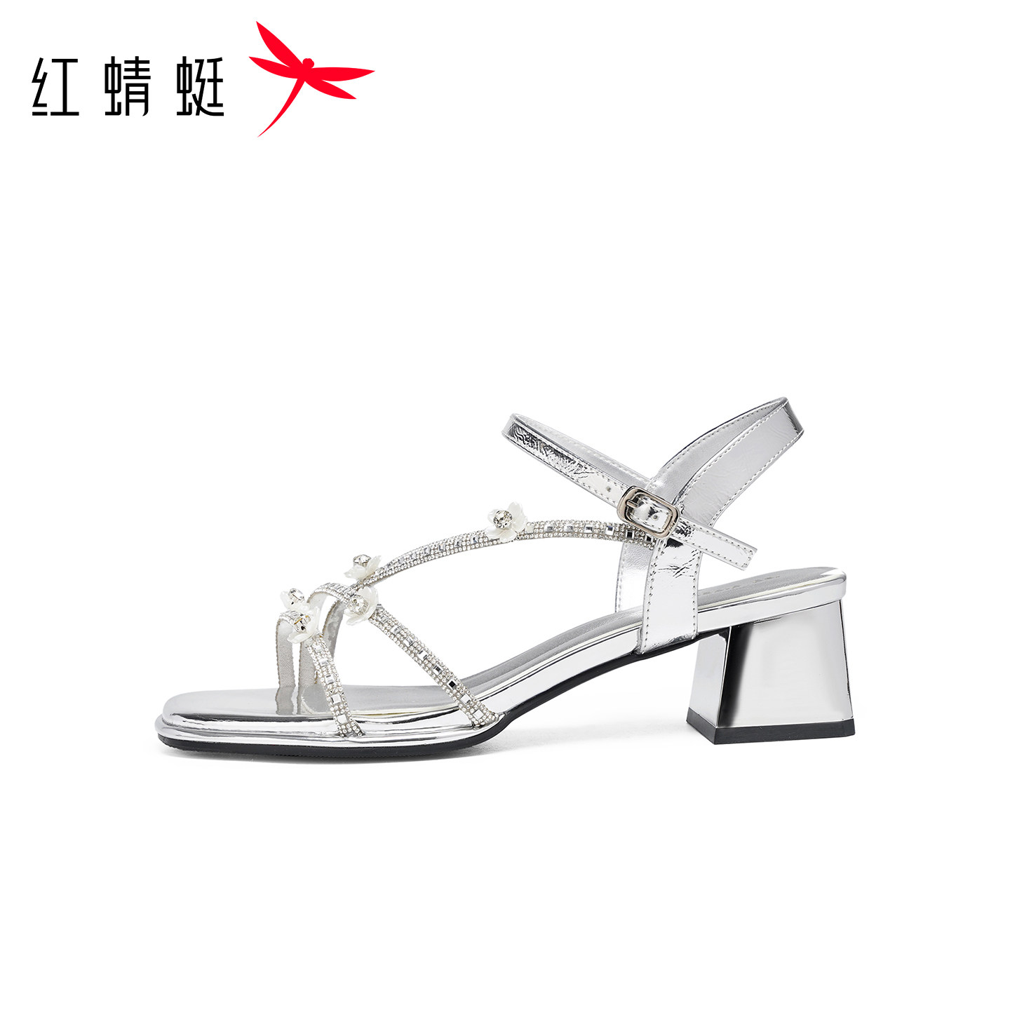 新款 2026夏季 女鞋 法式 红蜻蜓粗跟凉鞋 气质仙女风花朵银色凉鞋 女款