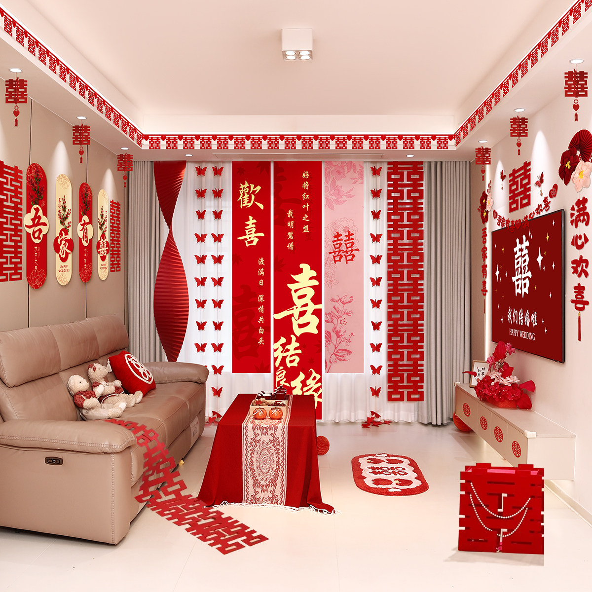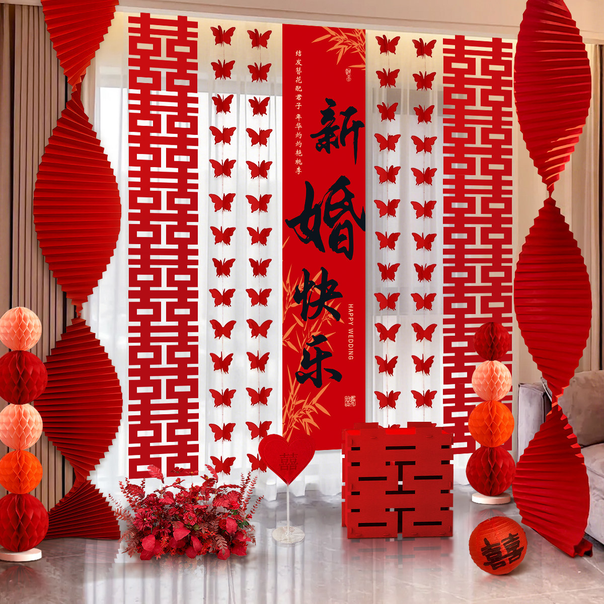 婚房布置套装 饰男方女方婚礼喜字蝴蝶挂饰 长条拉花客厅窗帘结婚装