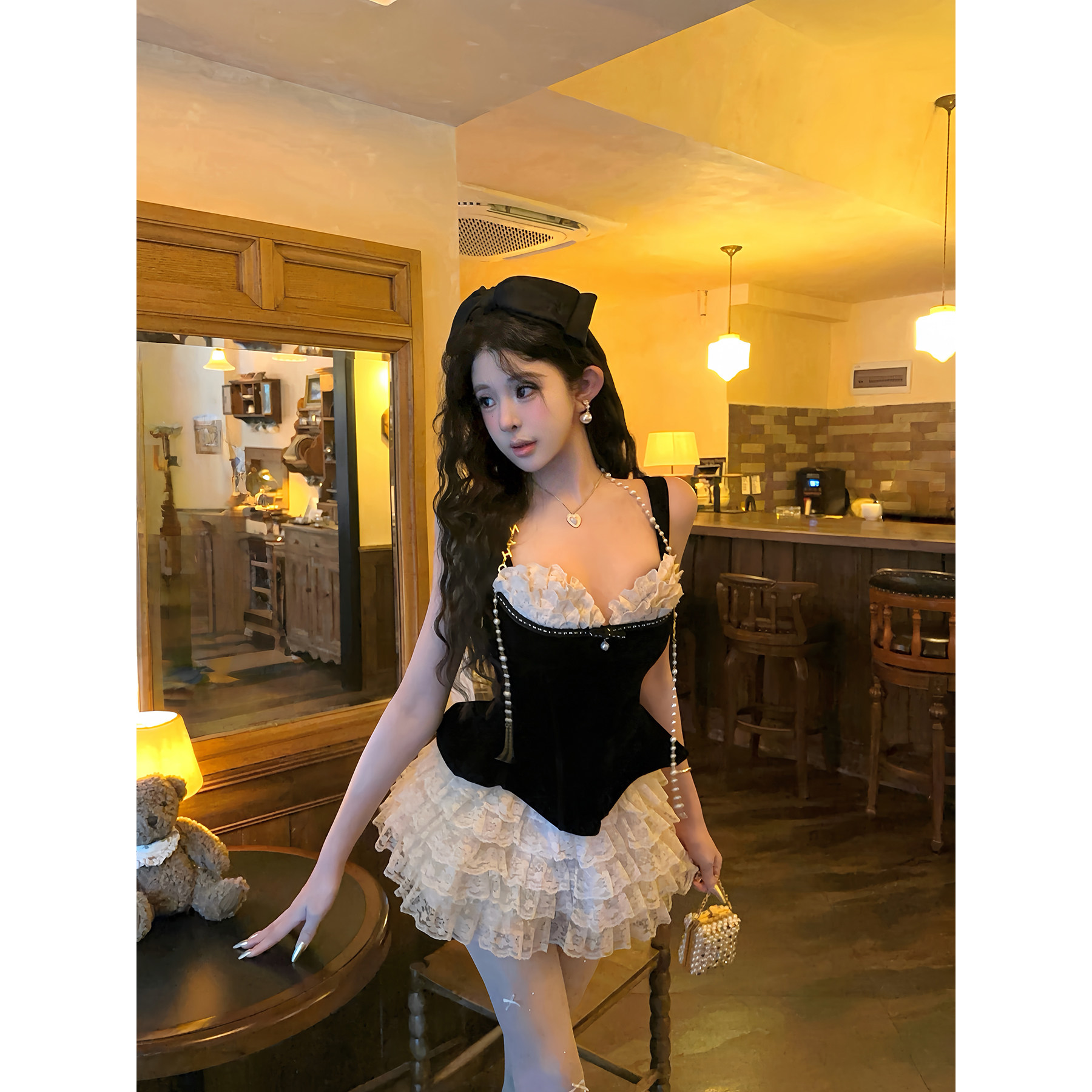 女2026早春丝绒拼接吊带上衣蕾丝半裙 套装 项天鹅er 千金小洋装