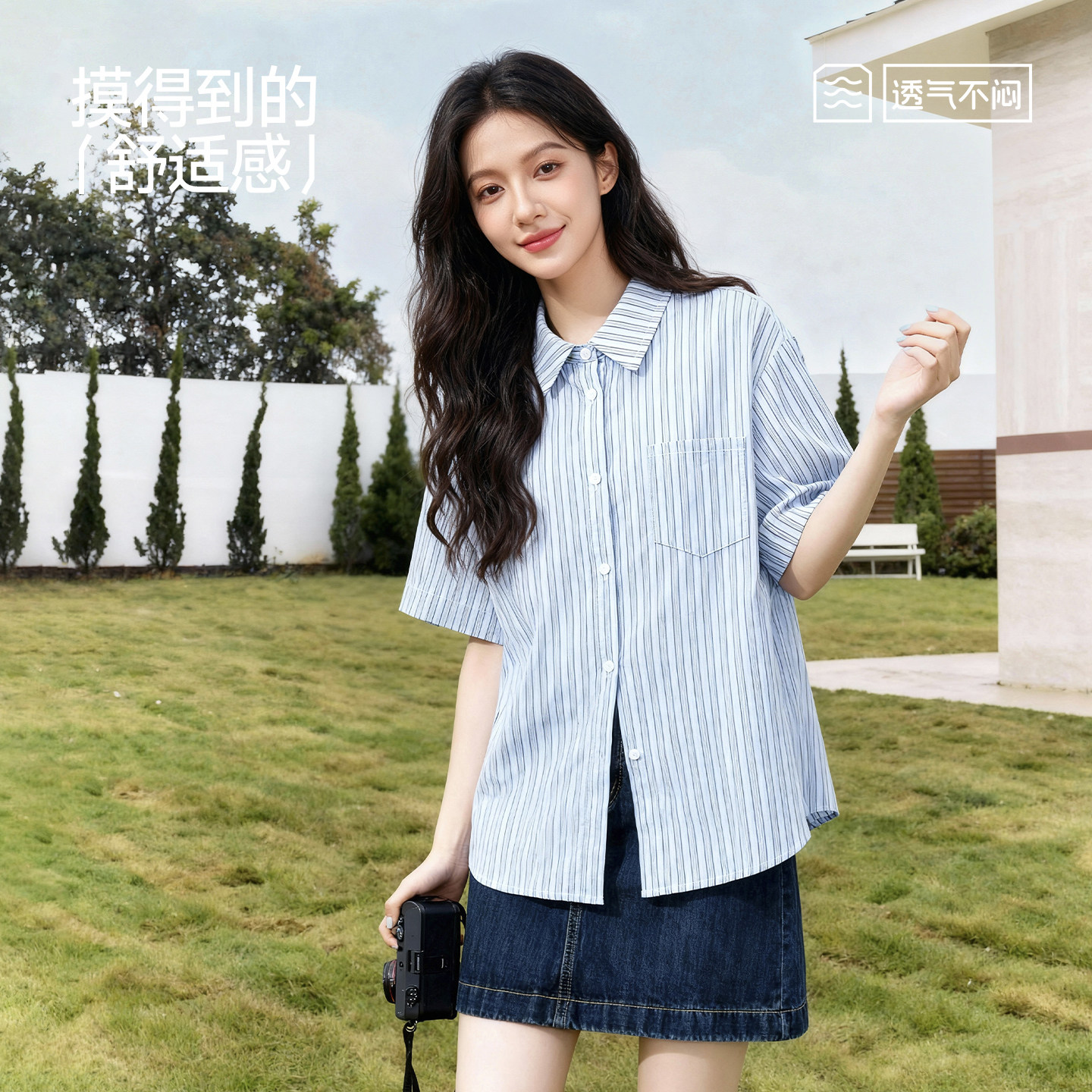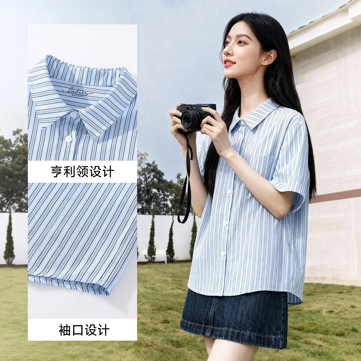 2026新款 班尼路蓝色条纹短袖 薄款 女夏季 polo领通勤上衣衬衣H 衬衫