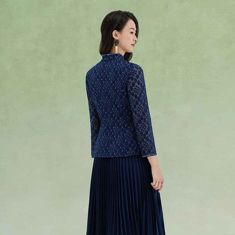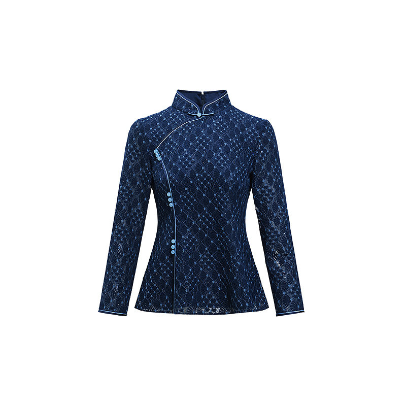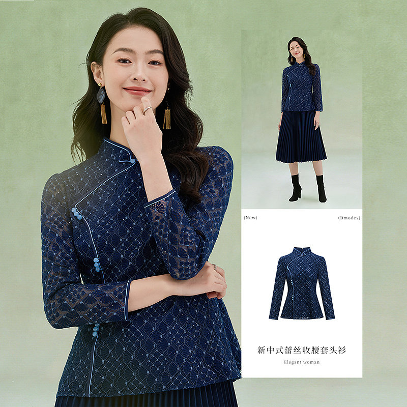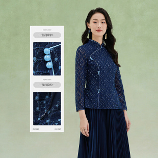 长袖 黛玛诗春季 改良旗袍领套头衫 民族风时尚 蕾丝收腰上衣女 新中式