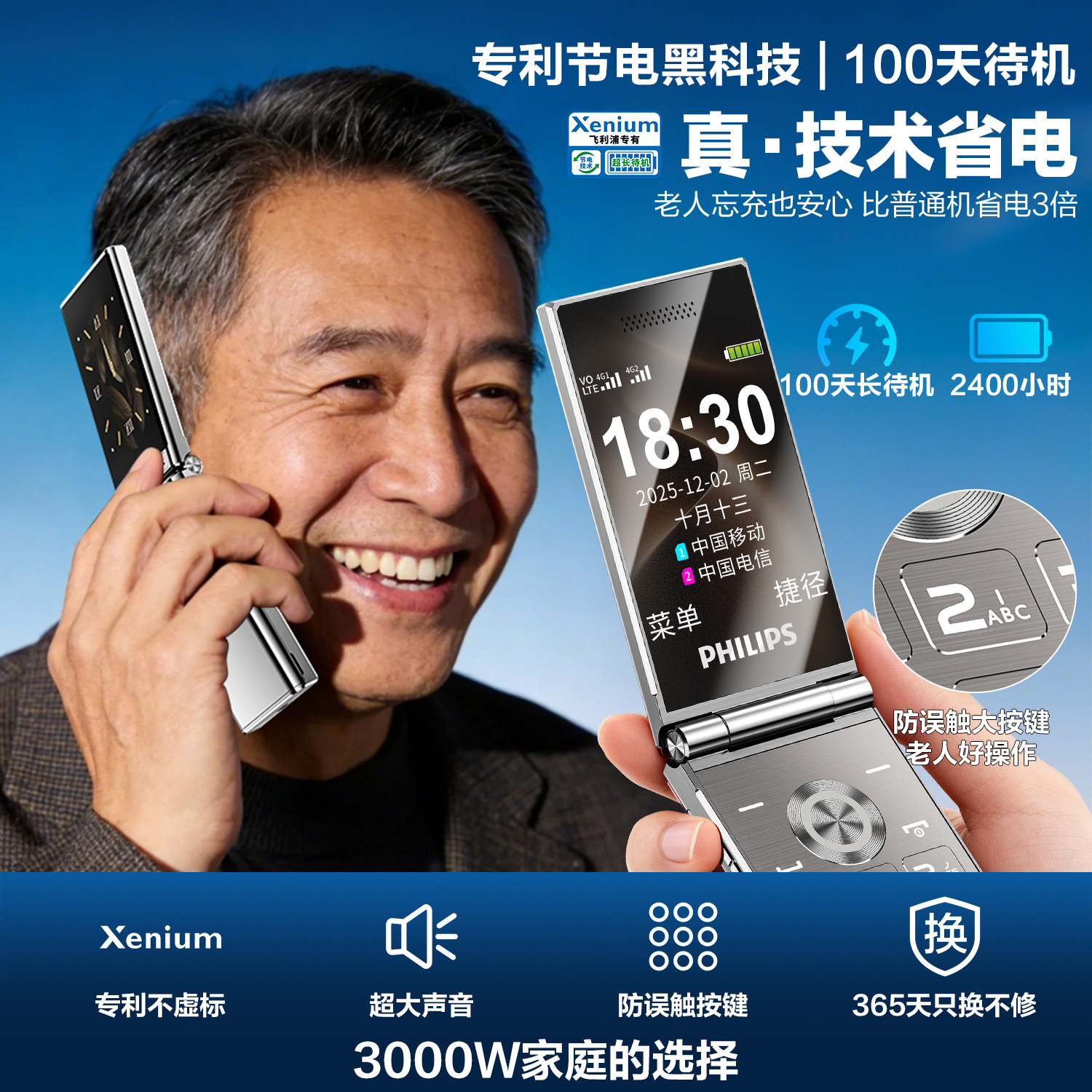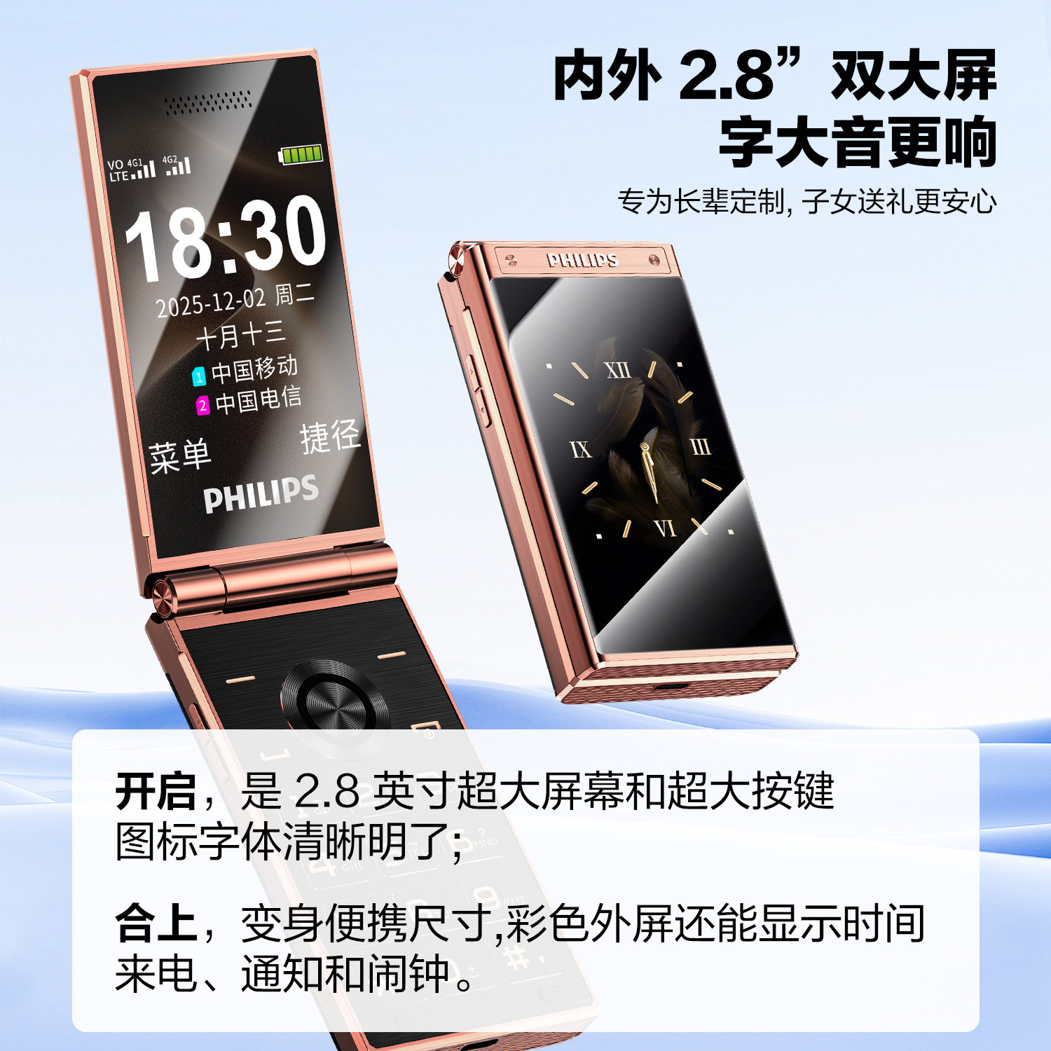 老年机正品 飞利浦E6618旗舰双屏翻盖2026新款 超长待机大屏大字大声音电信4G全网通按键老人机 官方旗舰店