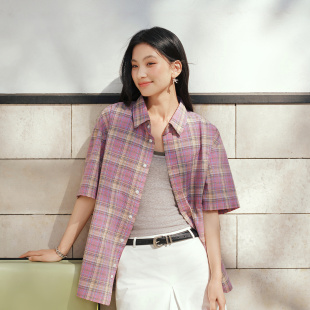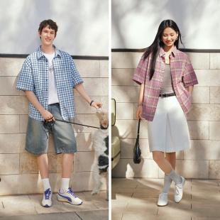 情侣装 森马短袖 时尚 男夏宽松格纹翻领上衣2026新款 衬衣休闲 衬衫