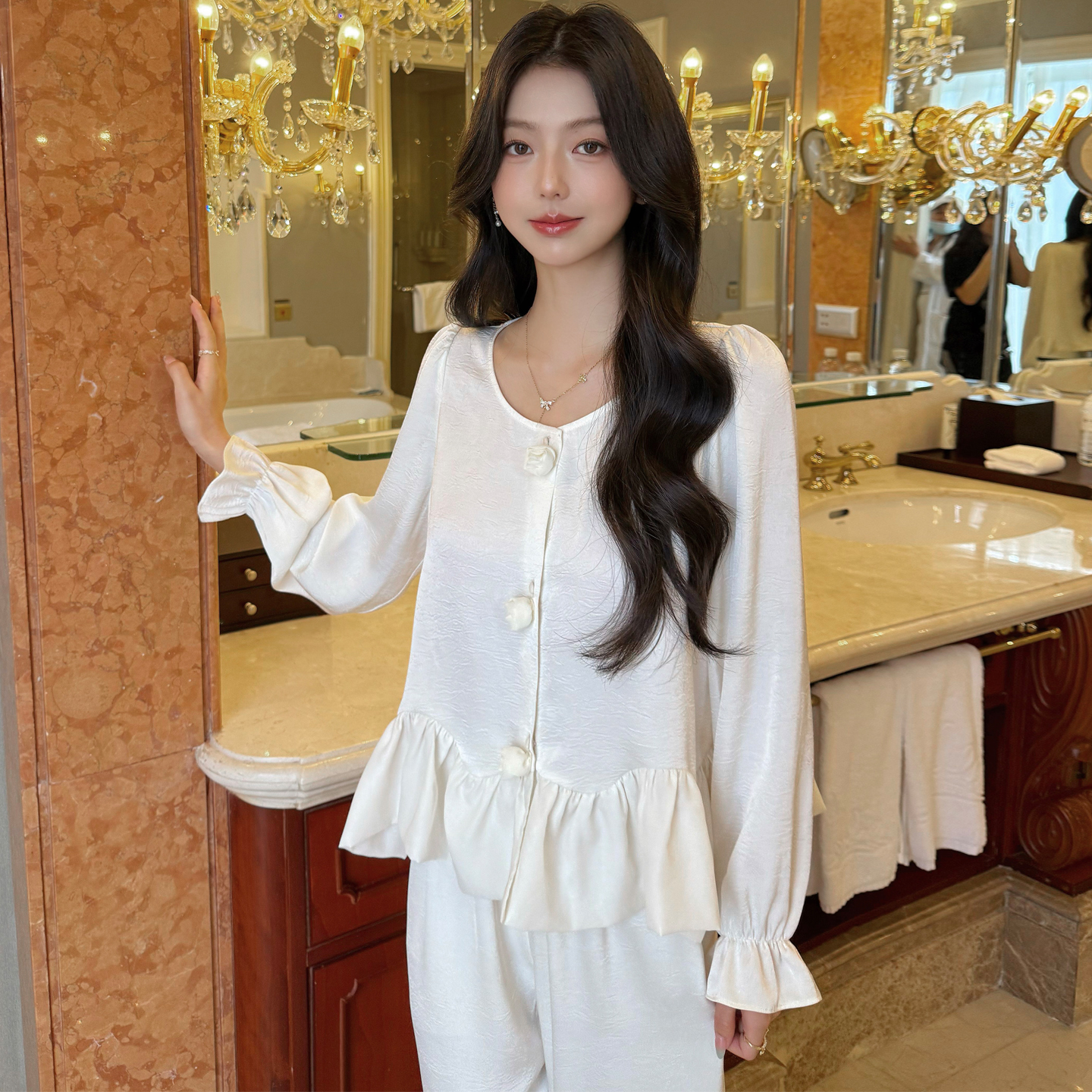 甜美公主风家居服套装 法式 纯棉带胸垫杏色长袖 春秋季 蕾丝睡衣女款