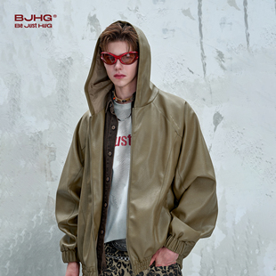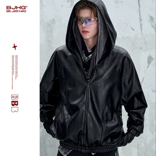 POPPROJECT皮衣bomber双层假两件连帽外套飞行员夹克皮质棉服ma1