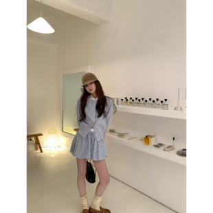 翻领衬衫 蓝格子套装 花苞裙短裙撞色系带上衣女 冷调锡蓝 aaaaxbbb