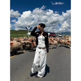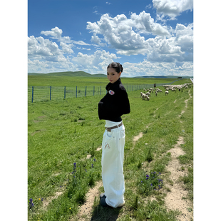 设计感直筒休闲阔腿百搭长裤 复古刺绣水洗弯刀牛仔裤 潮 美式 F383