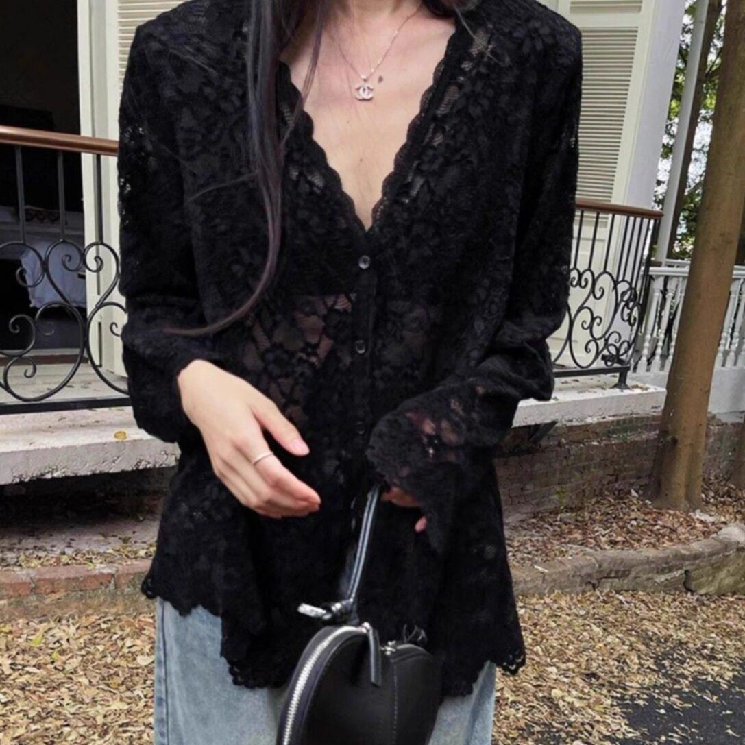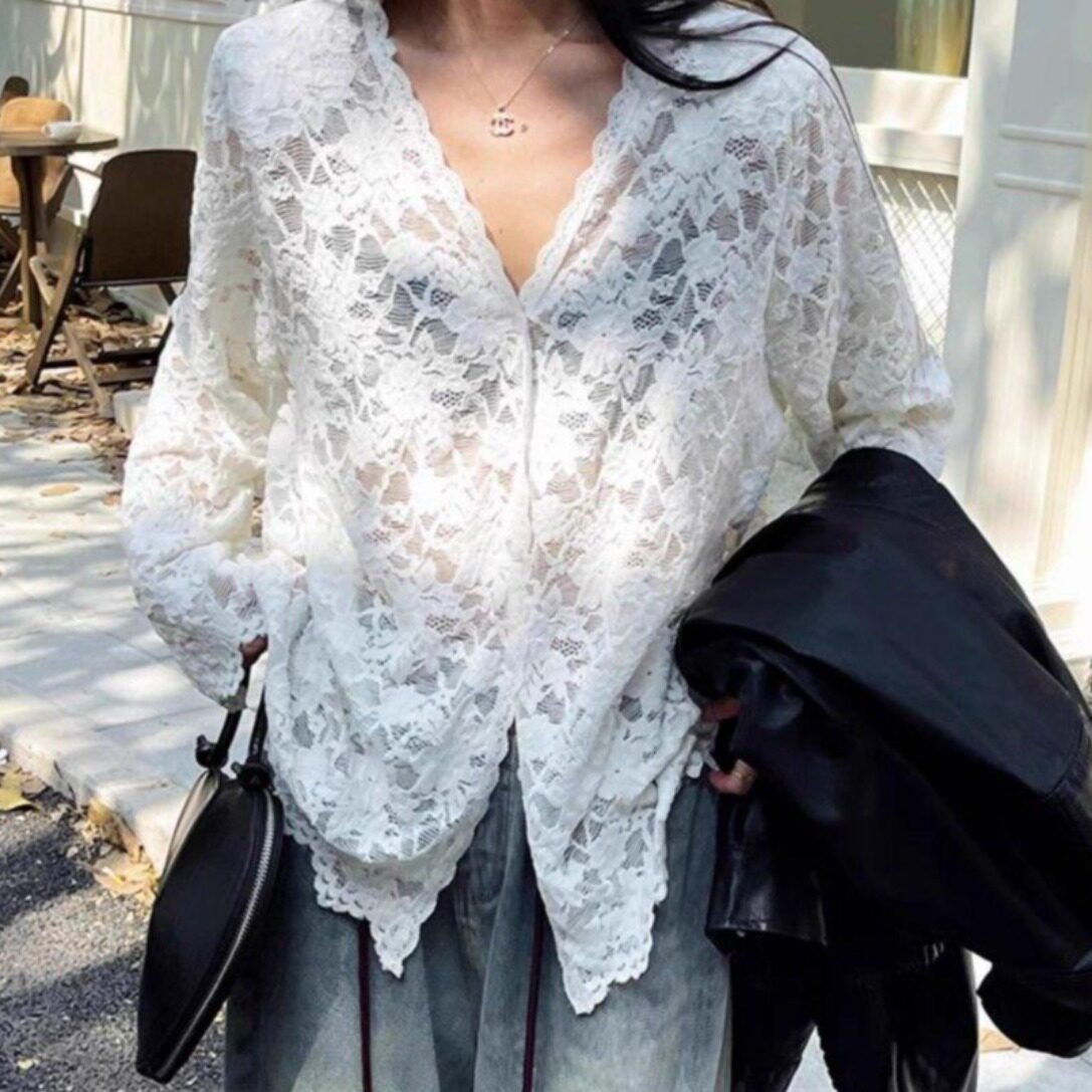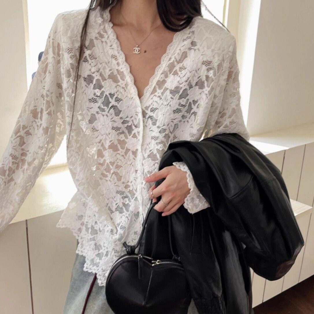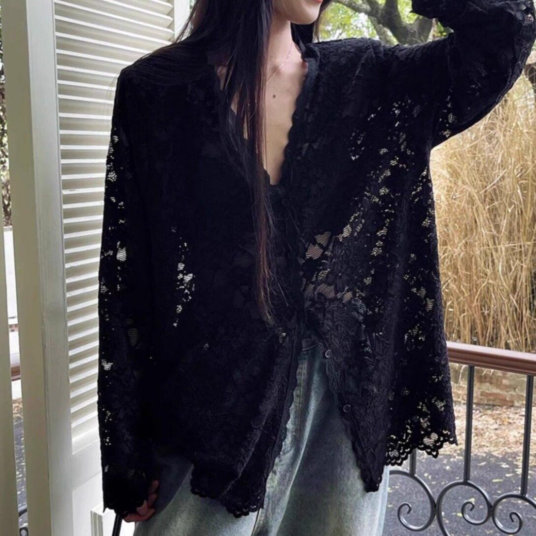 胖妹妹韩版 洋气百搭宽松显瘦开衫 女装 V领单排扣蕾丝衫 潮 时尚 大码