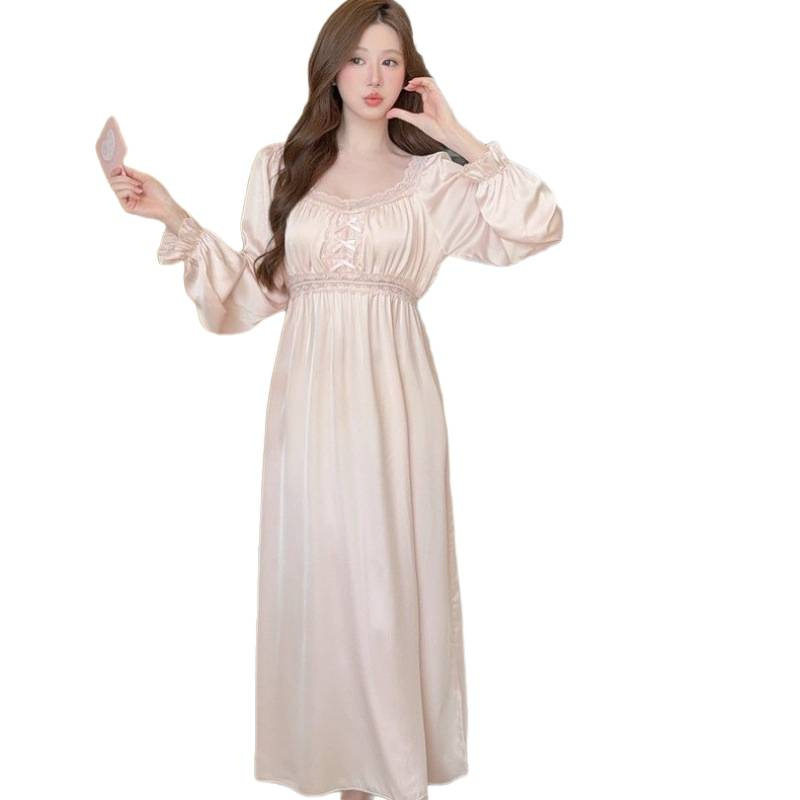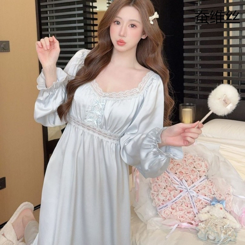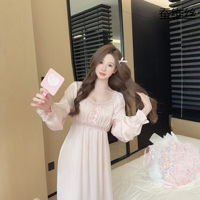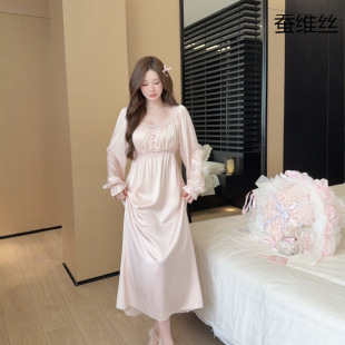 蚕维丝甜美法式 睡裙蕾丝领口套头长裙睡衣居家服亲肤舒适缎面 长袖