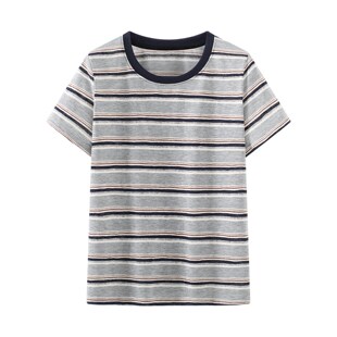 T恤Y26125 百搭休闲通勤日常舒适时尚 夏季 女简约亚麻圆领条纹短袖