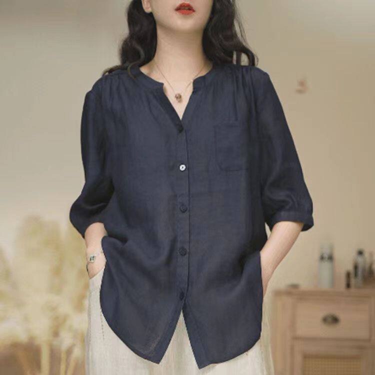新款 上衣夏季 百搭V领设计感女 棉麻衬衫 休闲通勤文艺复古休闲半袖