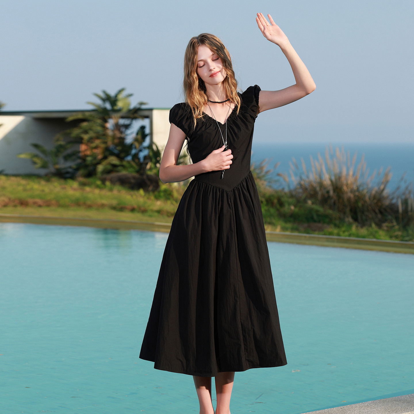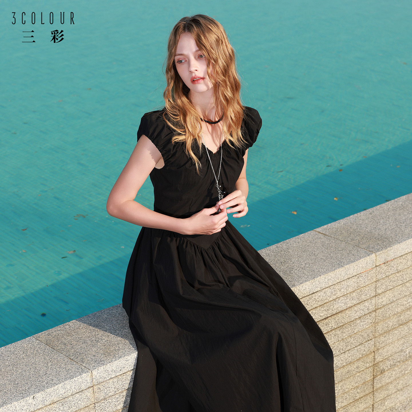 三彩2026夏季 V领小黑裙连衣裙收腰大摆A字长裙简约气质M女 新款