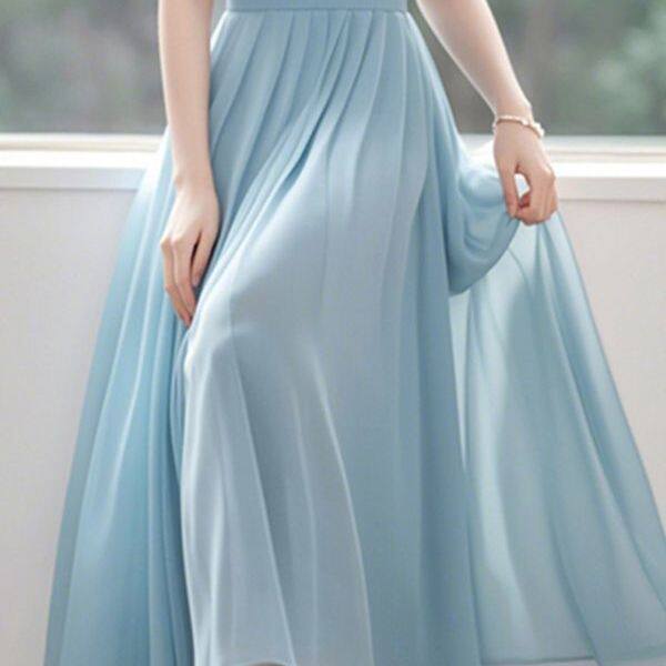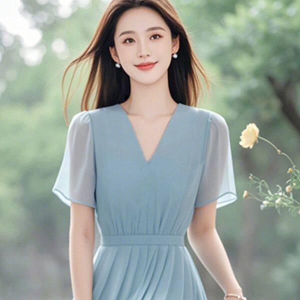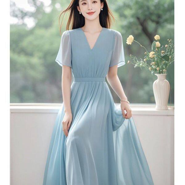 今年流行夏季 漂亮简单大方长裙高级淑女气质蓝色雪纺连衣裙女夏