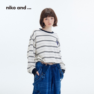 棉质条纹猫咪刺绣长袖 niko 新款 ...T恤女2026春季 上衣499075 and
