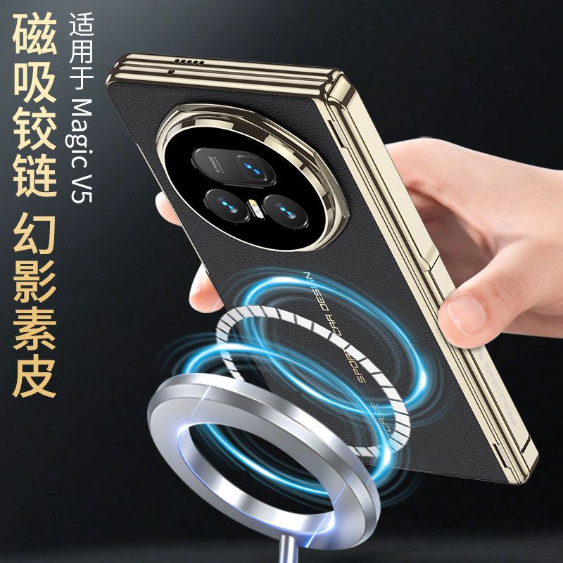 适用荣耀MagicV5手机壳新款 华为magic折叠屏V5保护套电镀皮纹MBH一AN10秒变XT非凡大师honor全包磁吸铰链支架