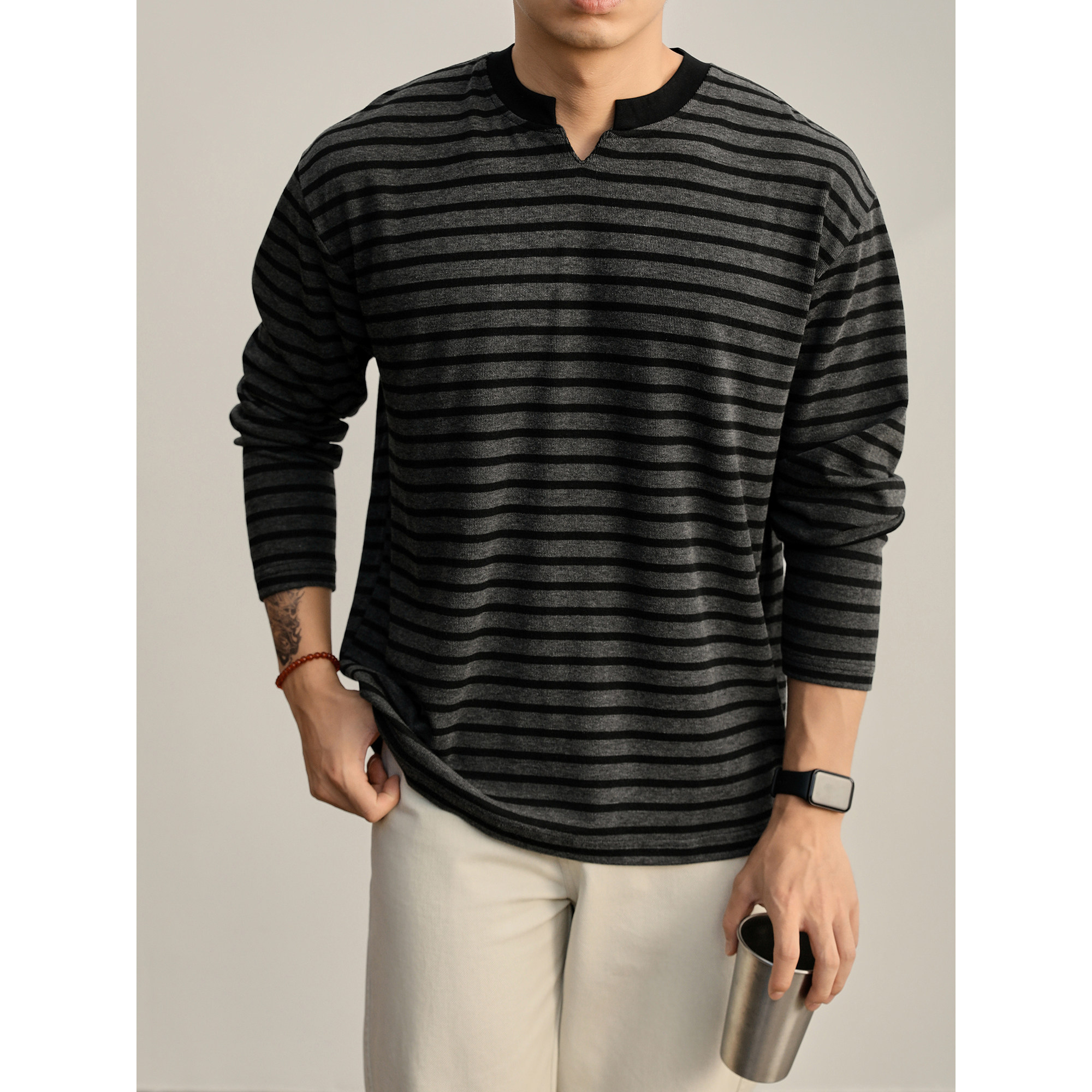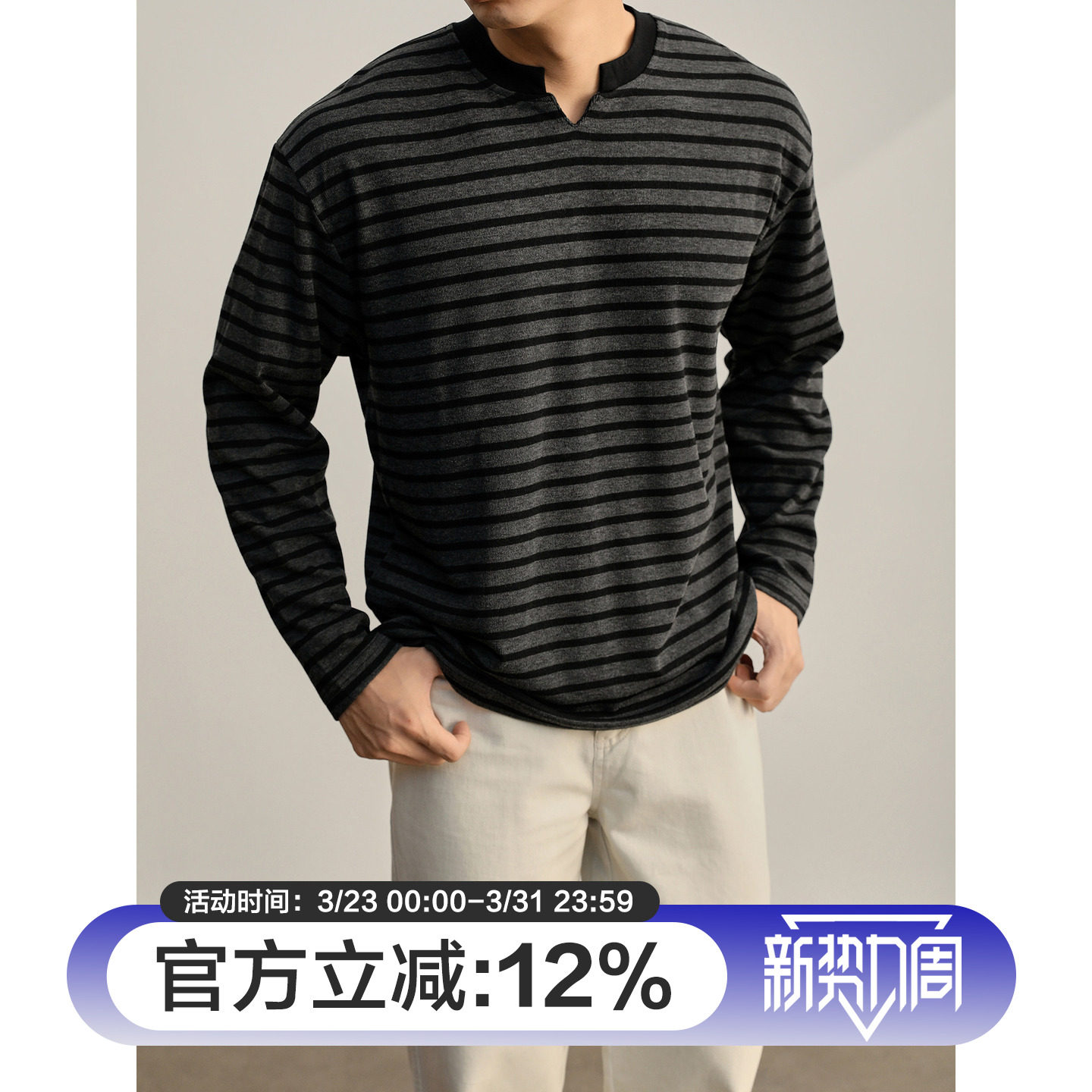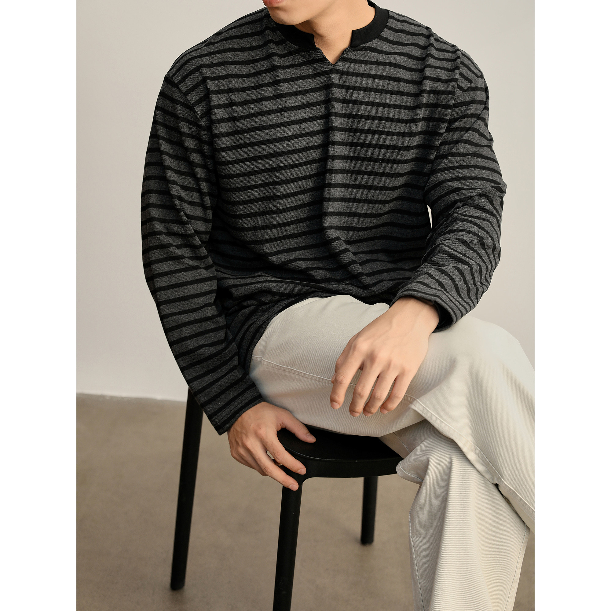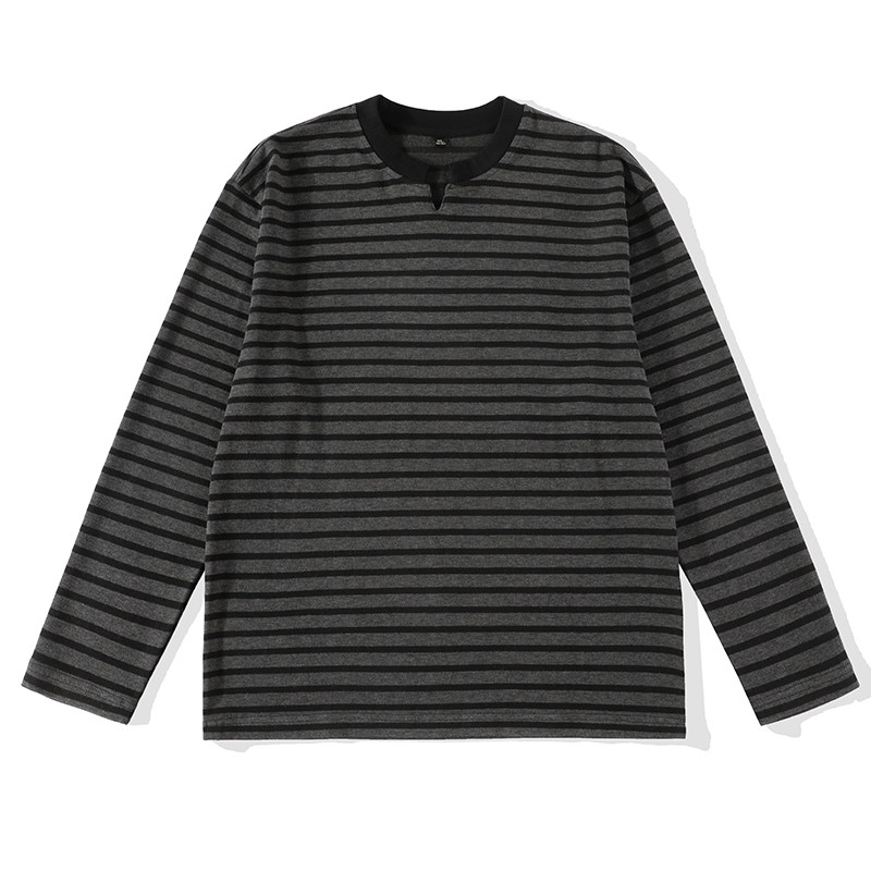 重磅280g撞色小V领长袖 宽松韩版 男 复古慵懒风条纹T恤针织衫 LUUD