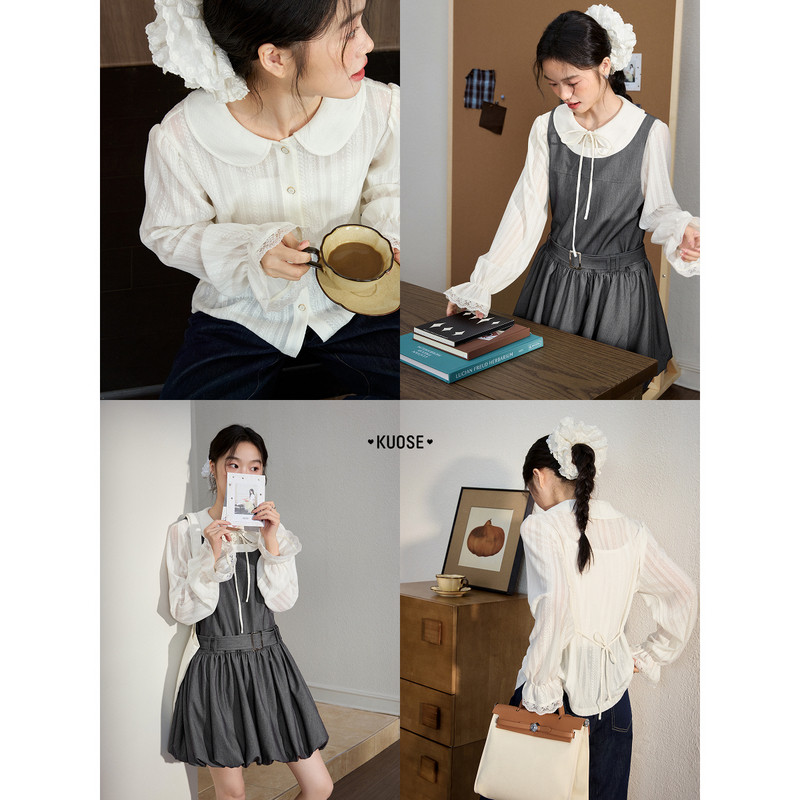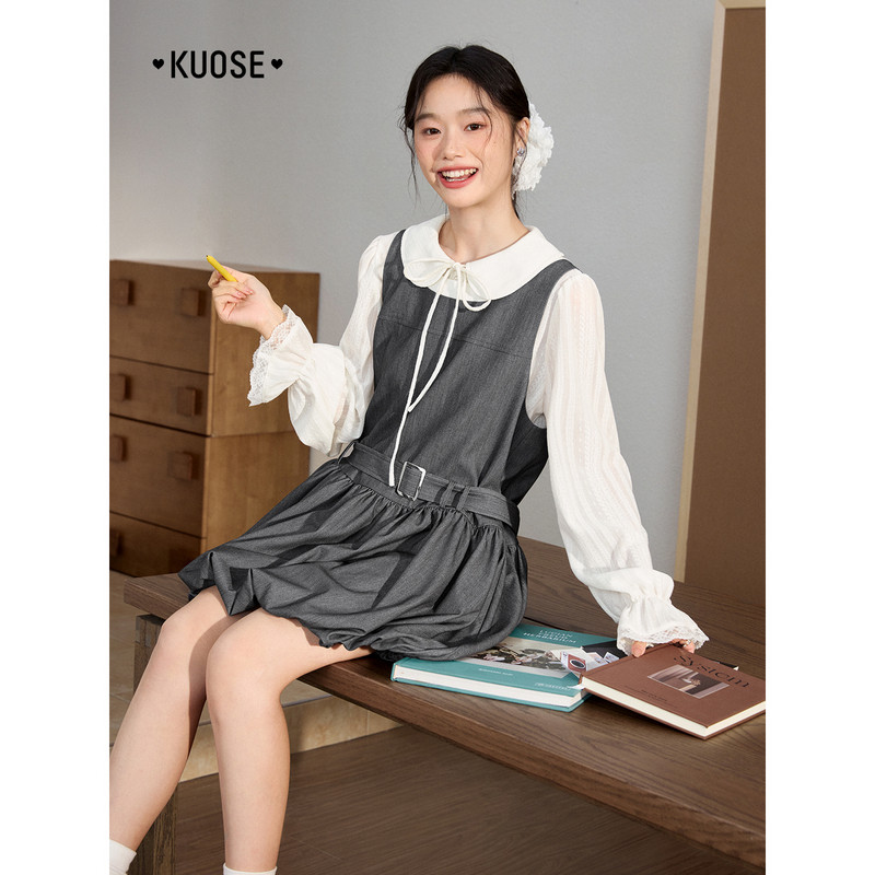 miu系穿搭 女25秋冬新款 阔色灰色花苞连衣裙内搭蕾丝衬衫 两件套装