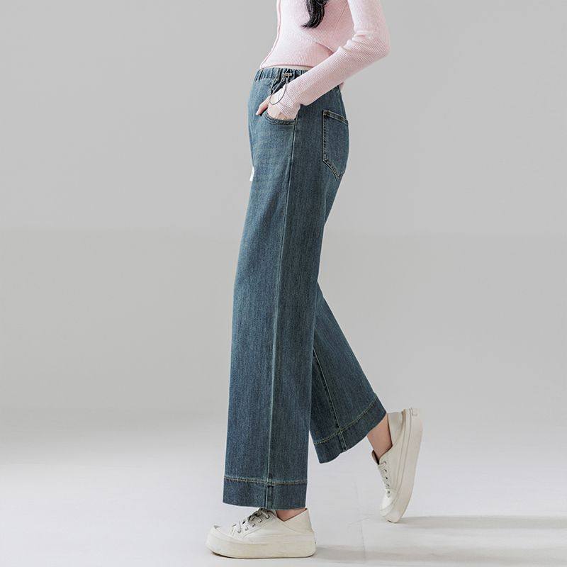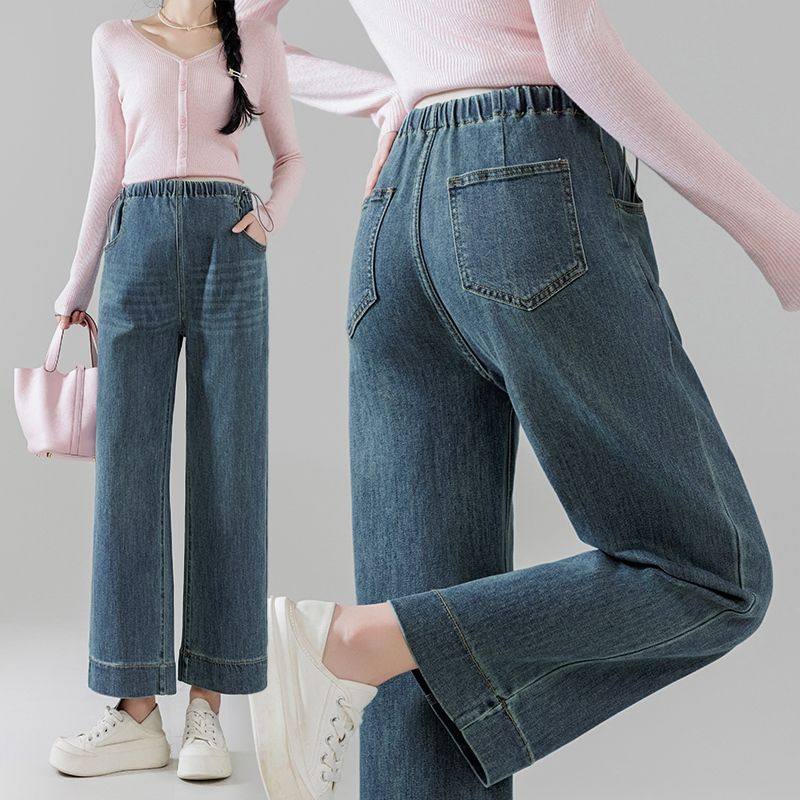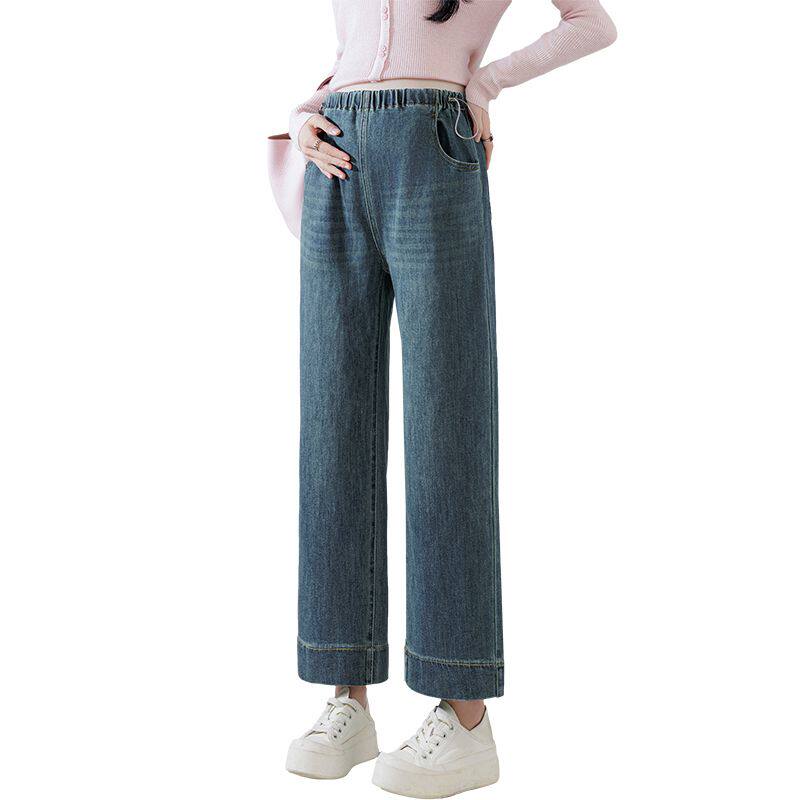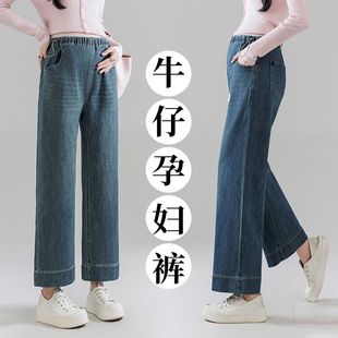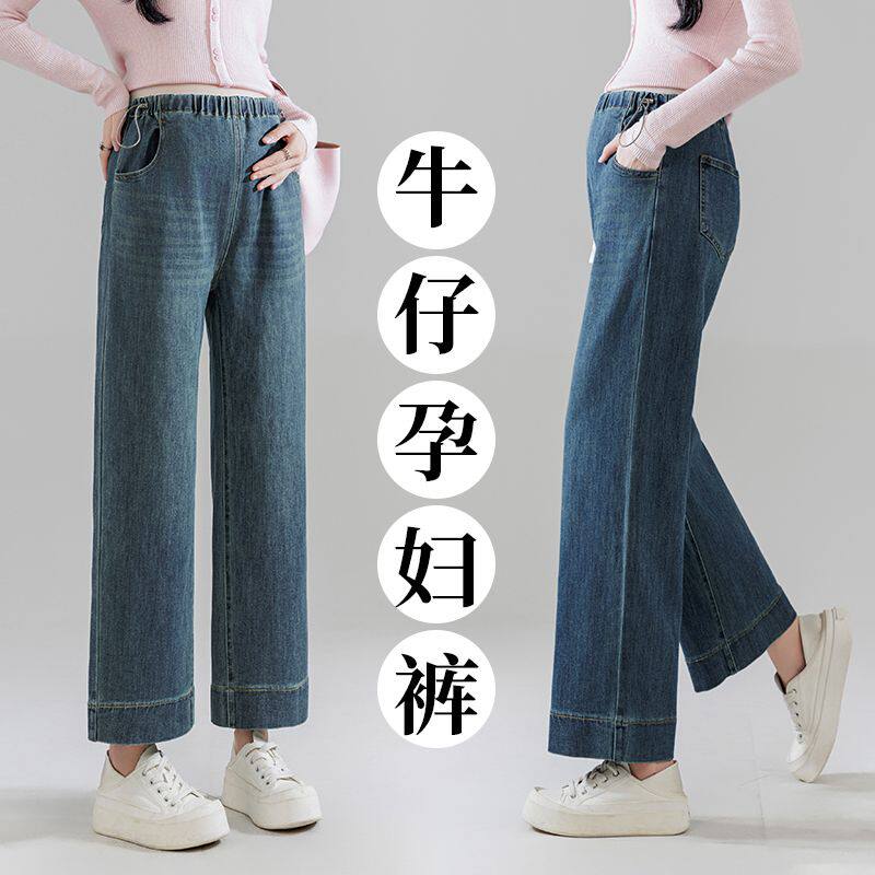 子冬季 显瘦直筒抽绳阔腿裤 九分春秋外穿2025新款 无托腹孕妇牛仔裤