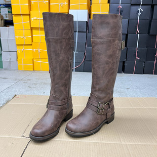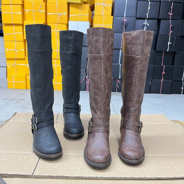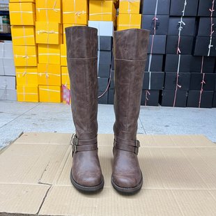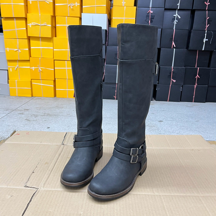 时尚 外贸原单女靴新款 圆头纯色粗跟皮带扣侧拉链长靴 Shoes Lady