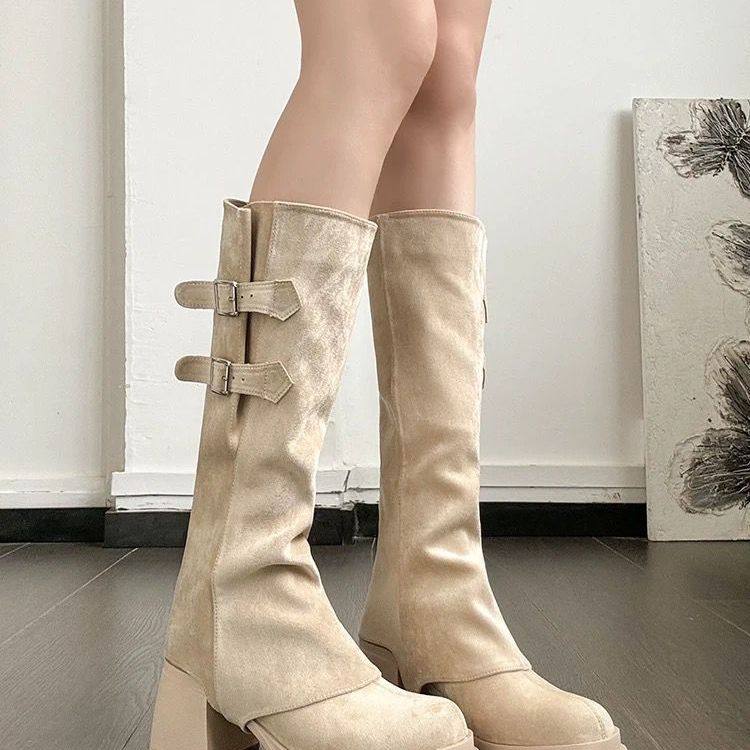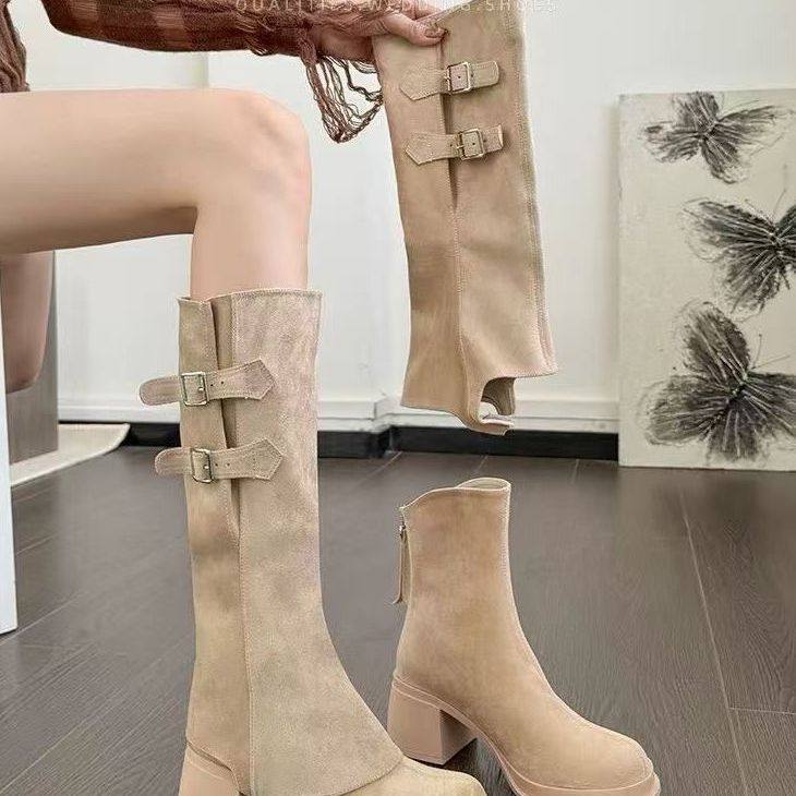 高筒可拆卸两穿短靴瘦瘦靴 爆款 裸色高跟靴子女秋冬季 长靴2025新款