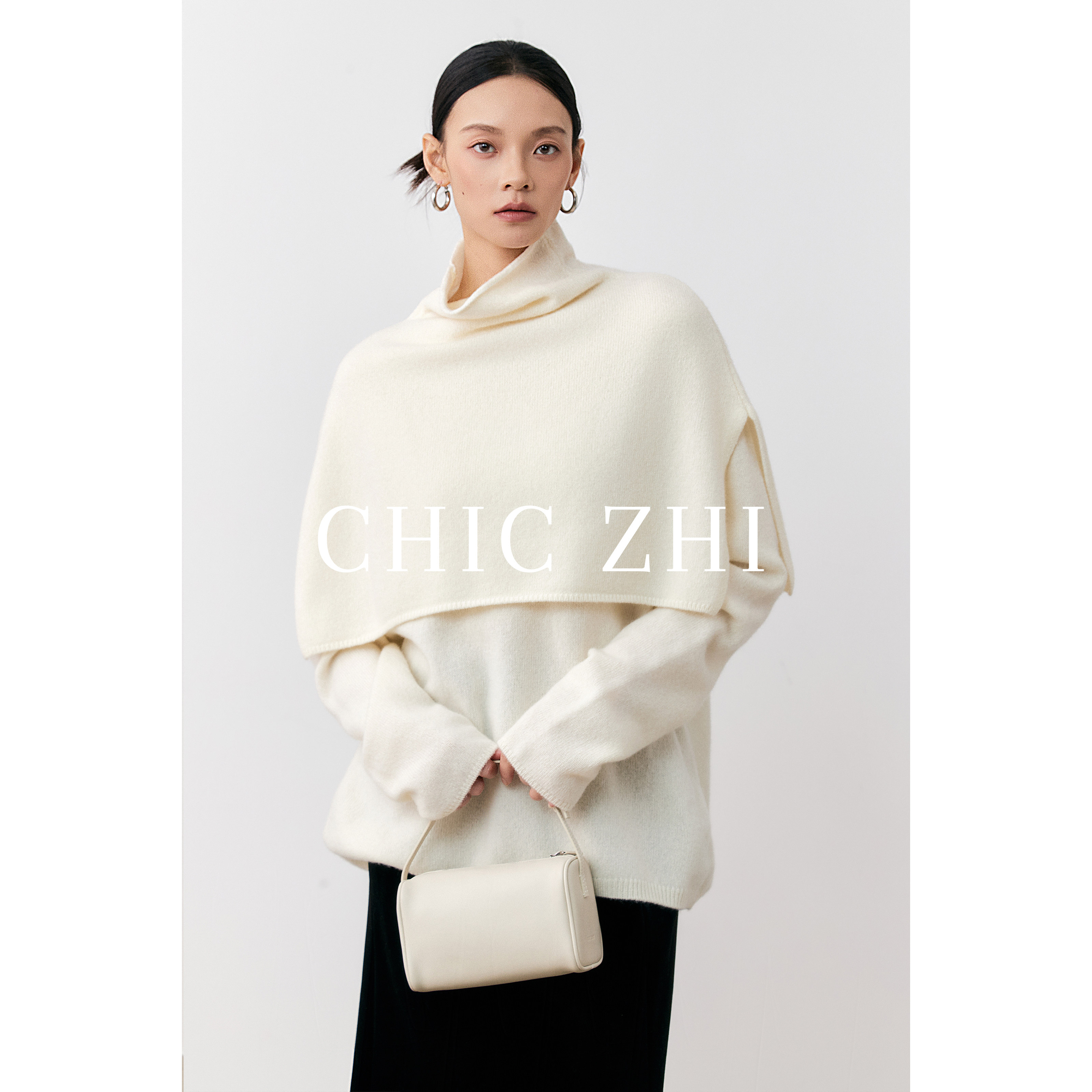 氛围感高领斗篷两件套100羊毛套头宽松针织衫 CHIC ZHI25冬季