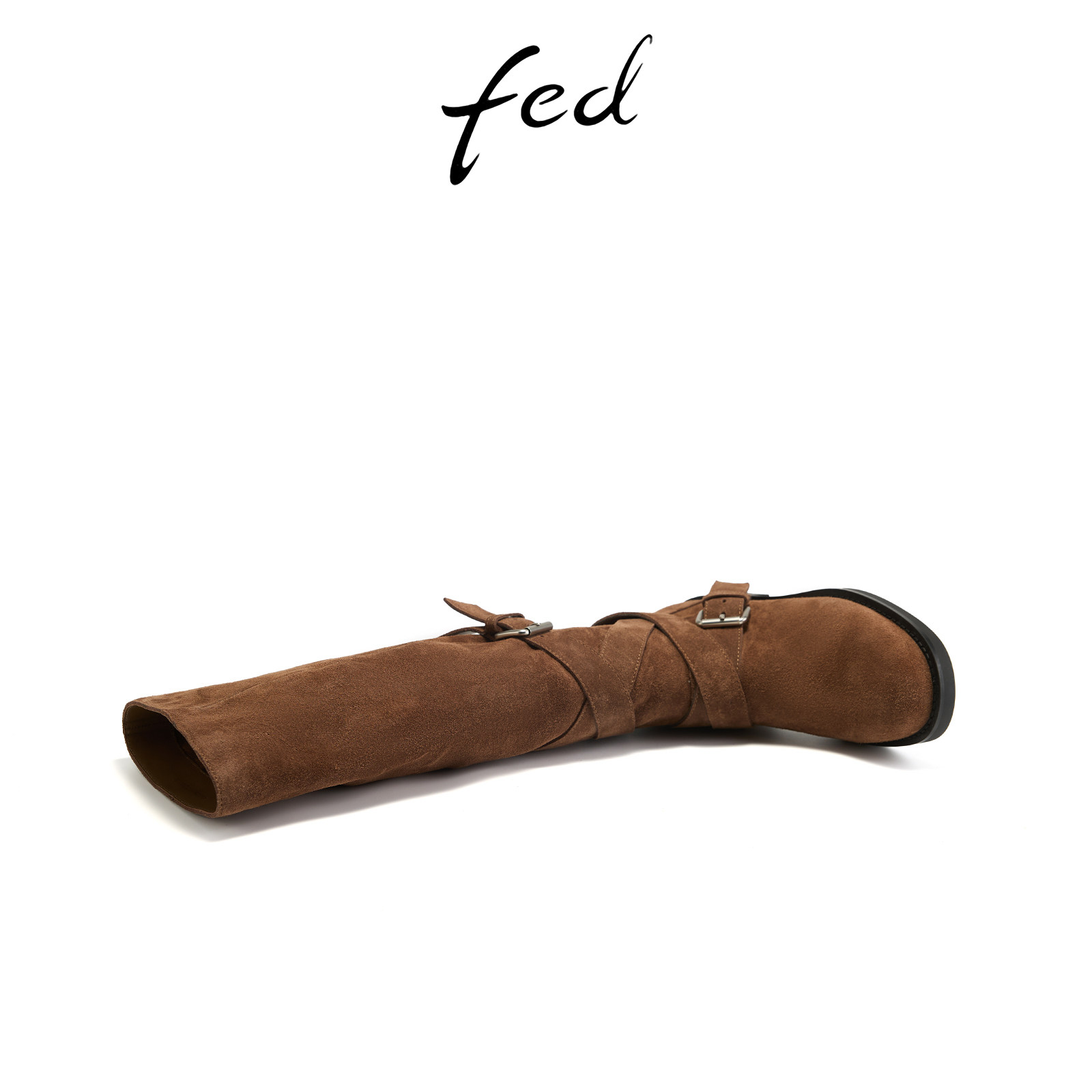 真皮 尖头复古西部机车褶皱堆堆靴 骄屿欧美辣妹风两穿长筒靴时尚