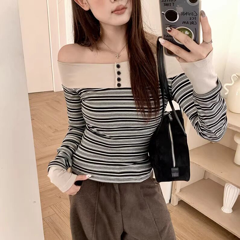 打底衫 纯欲气质一字肩条纹长袖 辣妹修身 法式 别致上衣潮 T恤女秋季