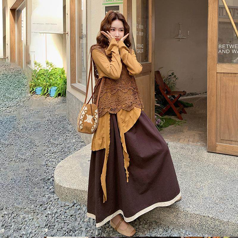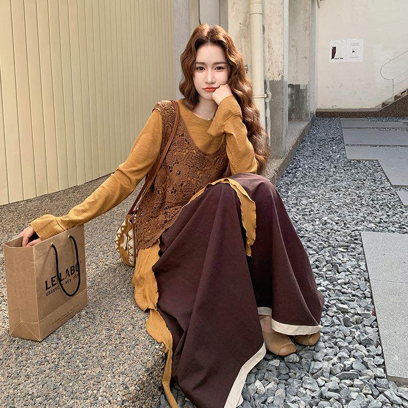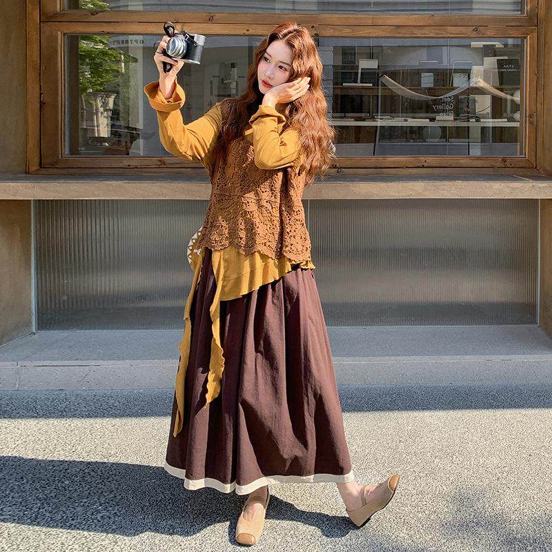 裙女秋法式 套装 半不规恤身裙三件 C22罩衫 则咖色复镂空钩花古c103