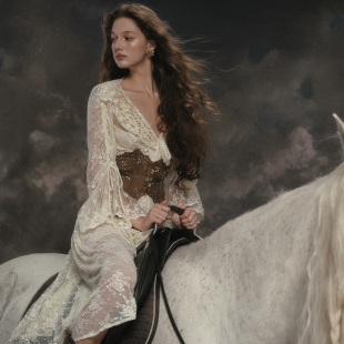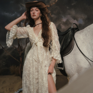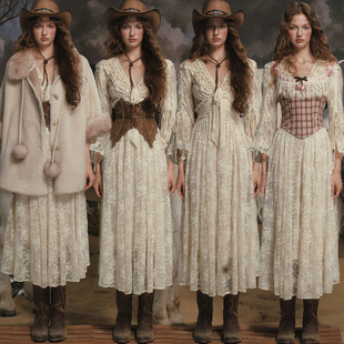 复古重工蕾丝v领连衣裙麂皮鱼骨腰封套装 法式 白马公主 LaceMade