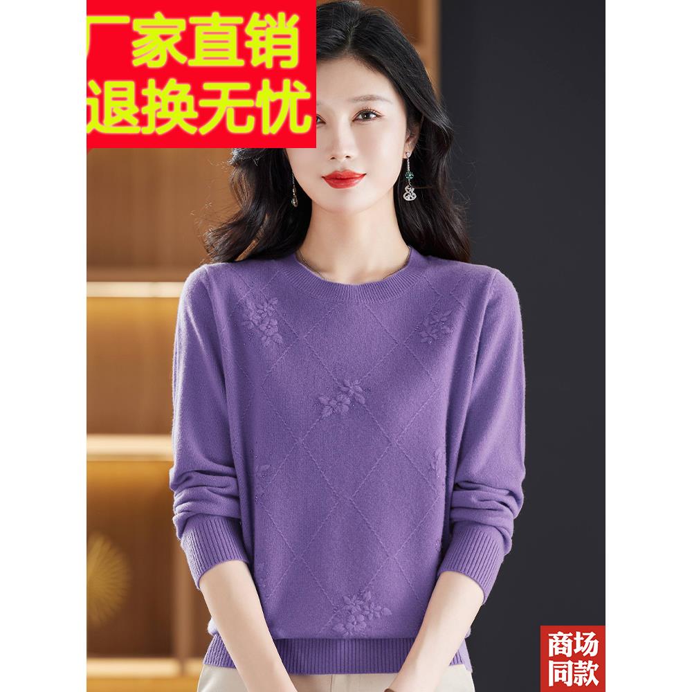 中老年圆领羊绒衫 妈妈秋装 打底薄毛衣 女秋冬新款 提花100纯羊毛衫