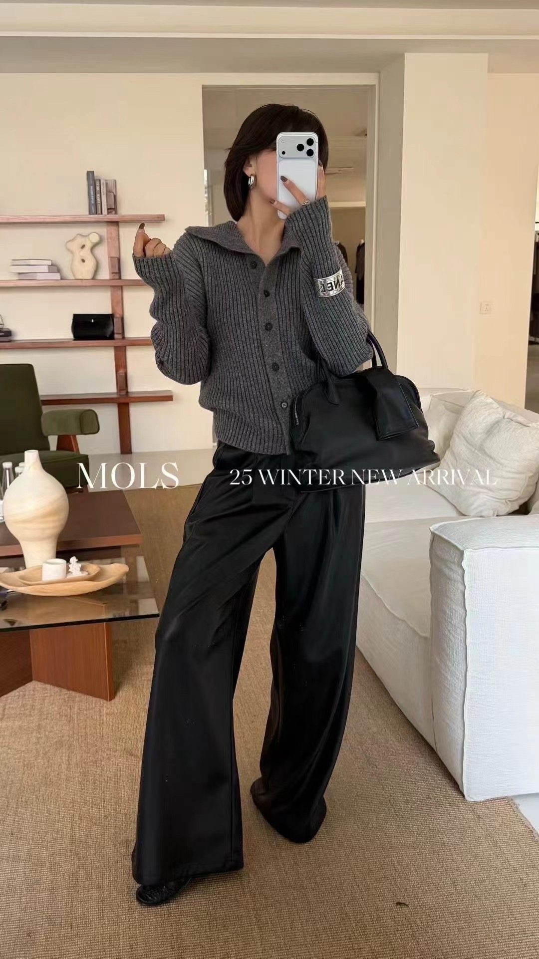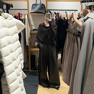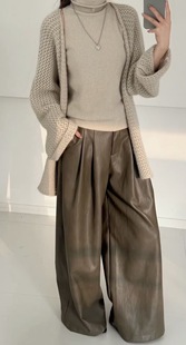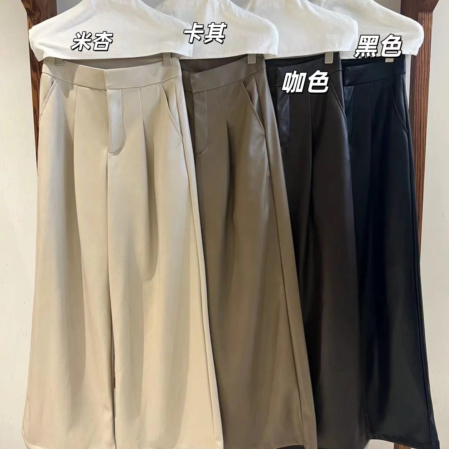 5131 女高腰直筒加绒PU皮阔腿长裤 mols秋冬韩版 宽松显瘦百搭休闲裤
