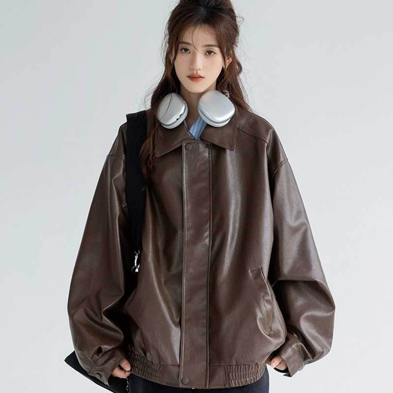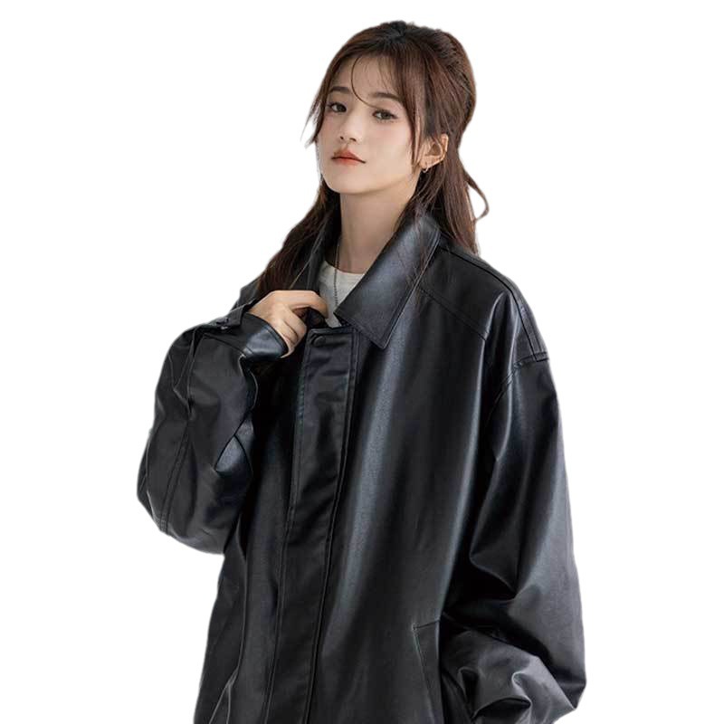 韩系黑色pu皮衣宽松休闲百搭外套复古上衣 nana SPEAR YOUTH