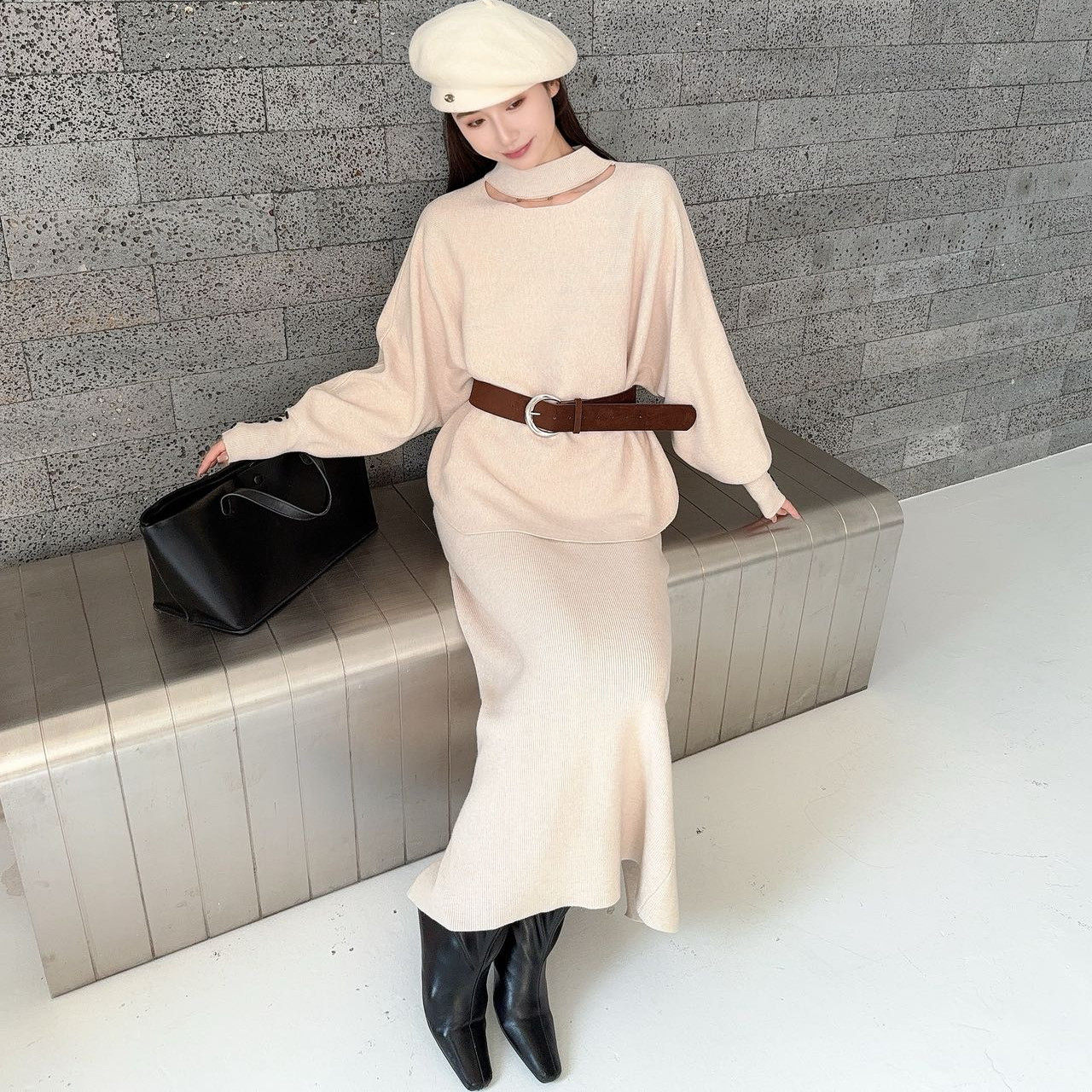 配腰带 女秋冬设计感百搭显瘦毛衣+高腰半身裙套装 针织衫 两件套装