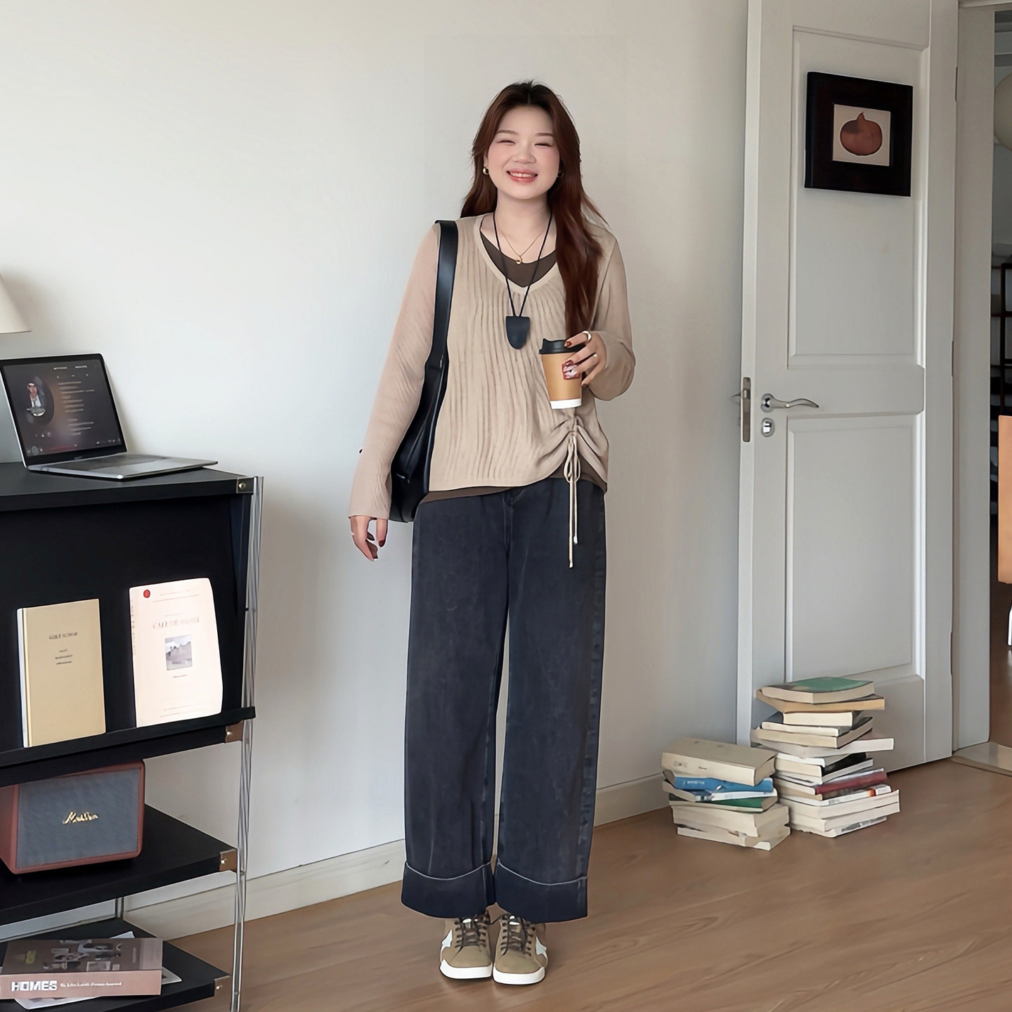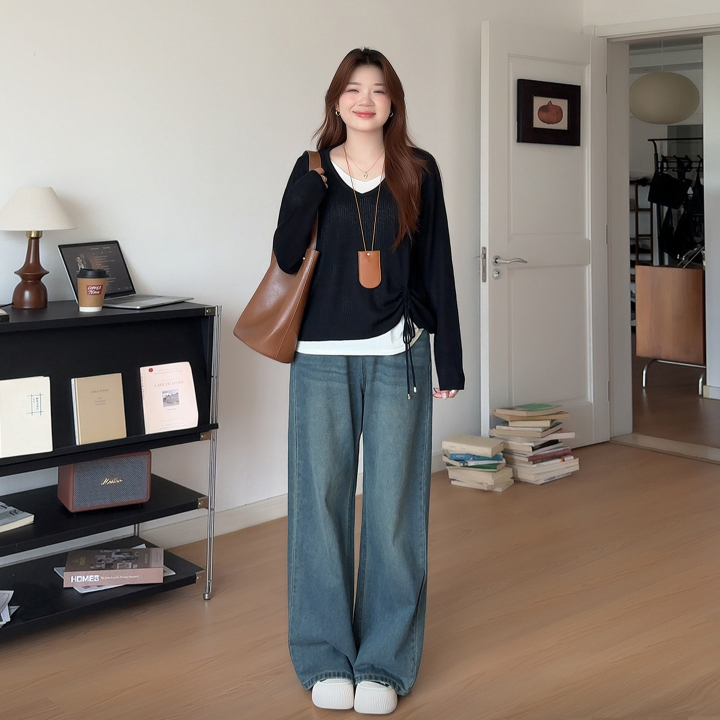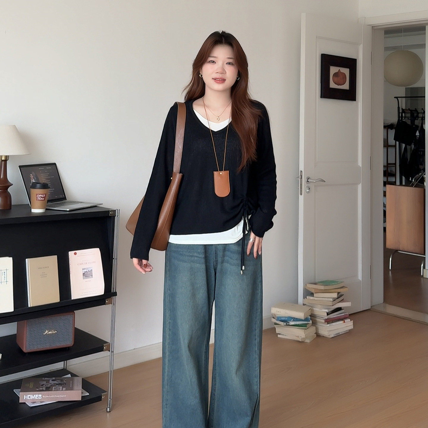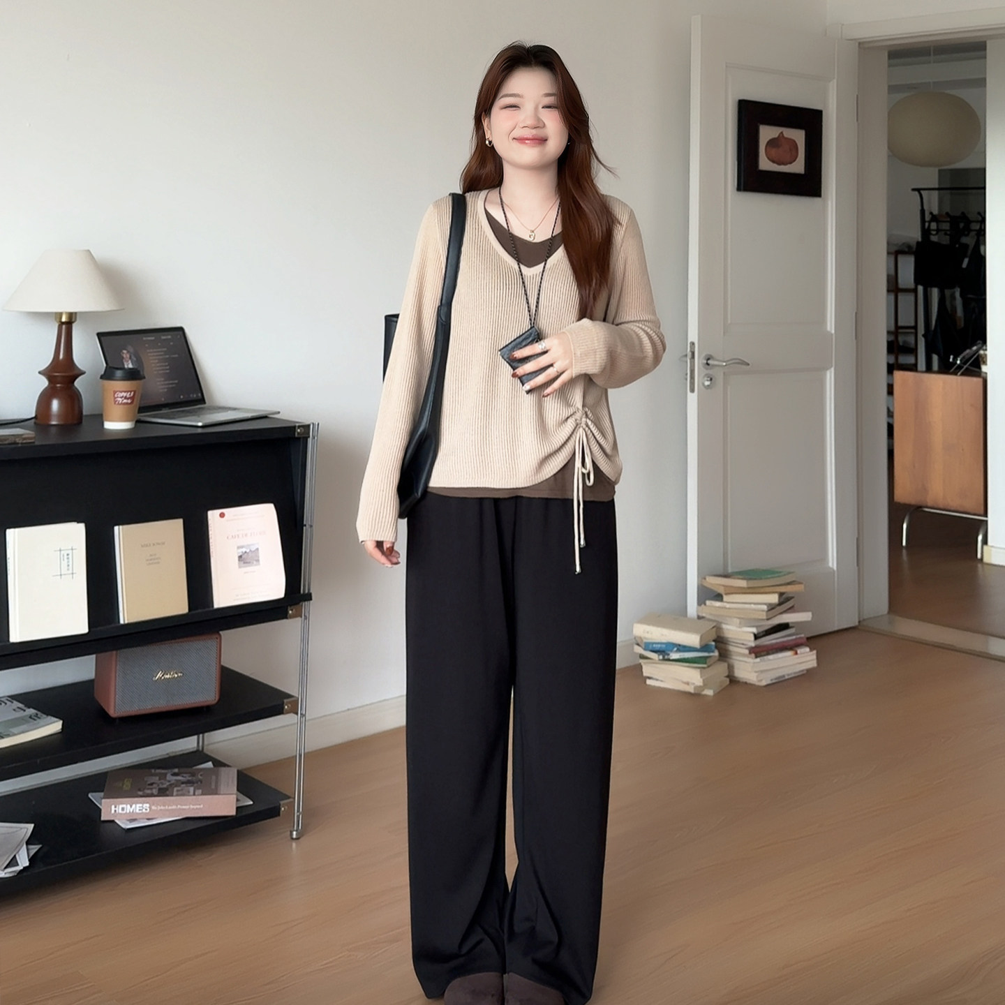 胖mm秋季 女装 穿搭巨显瘦抽绳打底内搭针织上衣2041 喵喵大码 微胖