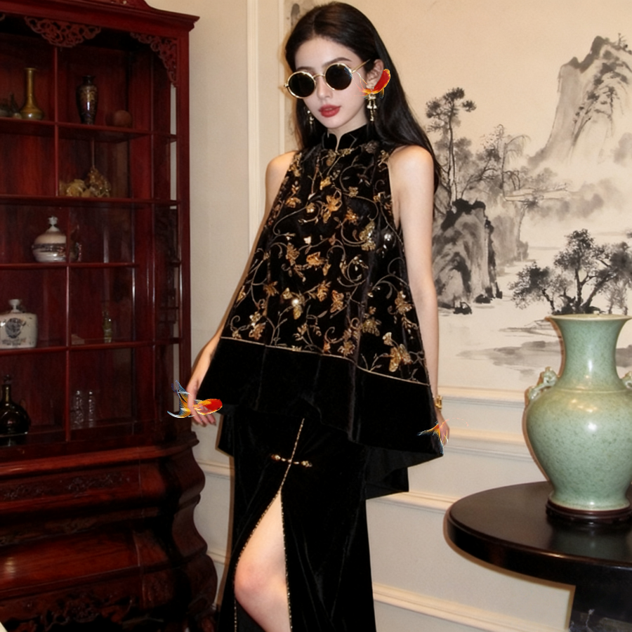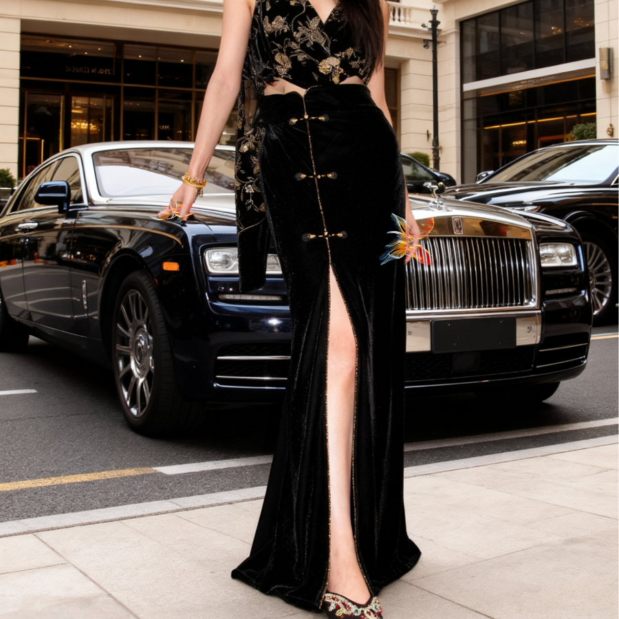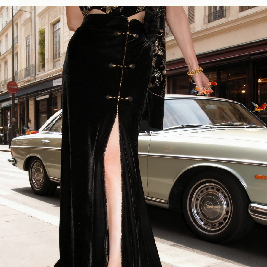 纯手工盘扣丝绒前开叉鱼尾半裙女 新中式 地球店 墨绣添香