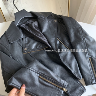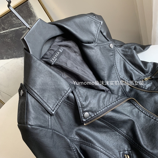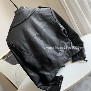 拉链正肩复古上衣 黑色立领pu皮衣外套女短款 pusumede 现货7折