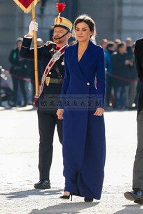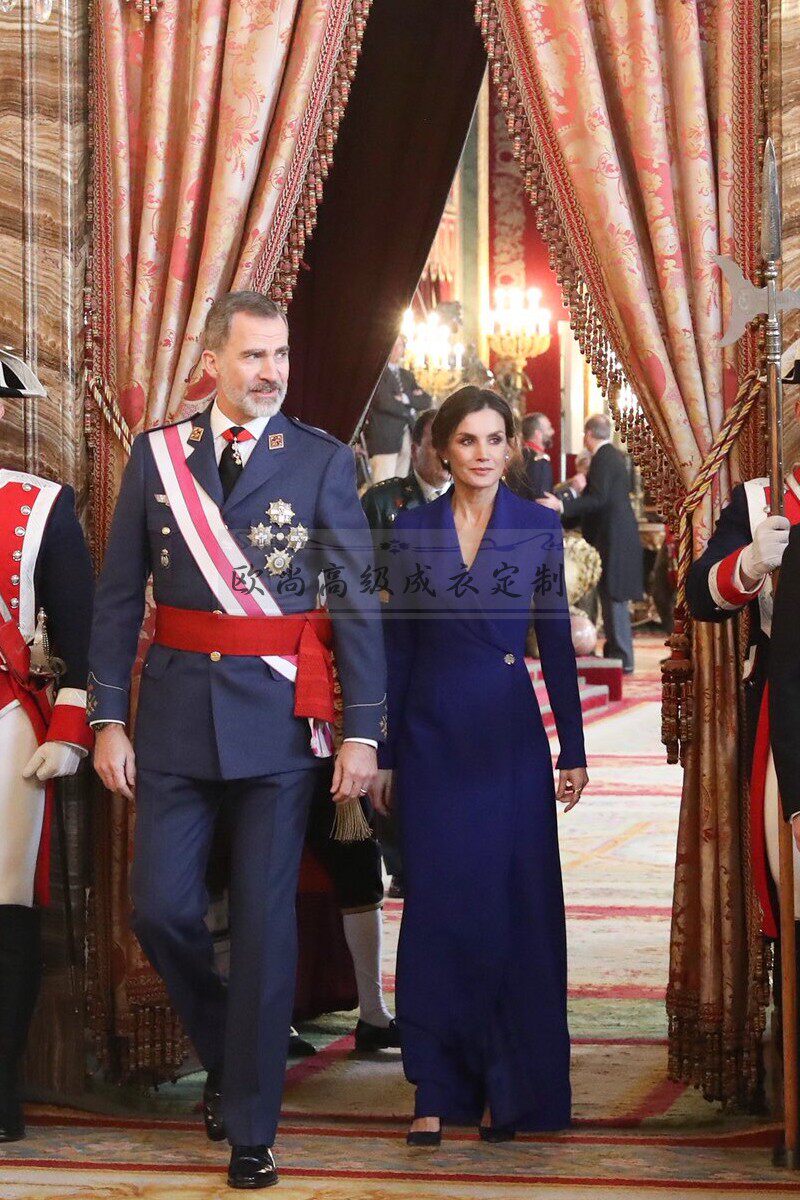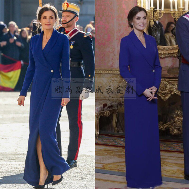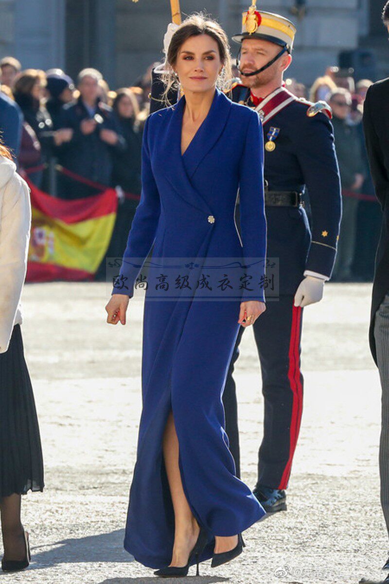 欧美 修身 高端定制莱蒂齐亚西班牙王后同款 青果领蓝色连衣裙女长款