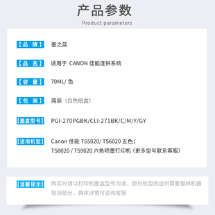 271六色连供墨盒TS5020 270 TS6020五色打印机连供系统含CA专用耐光墨水 TS8020 墨之蓝适用佳能TS9020