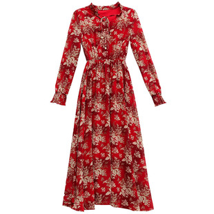 碎花裙大码 收腰显瘦休闲气质荷叶边长款 雪纺连衣裙女2025新款 长袖