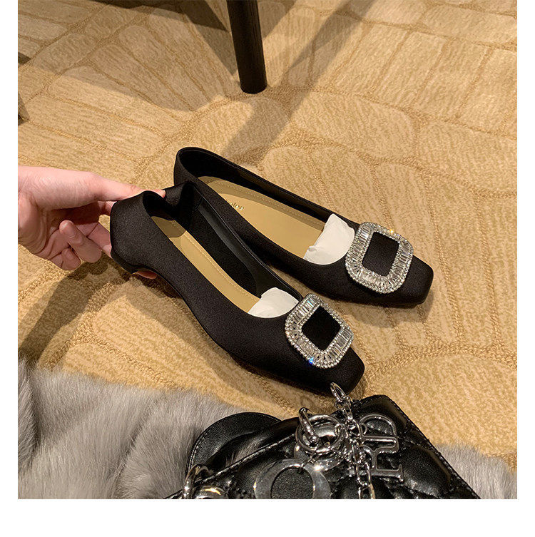 女 钻扣精致小方头缎面浅口粗跟中跟单鞋 葡萄妈同款 内增高3cm