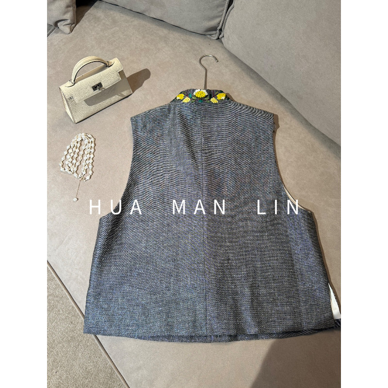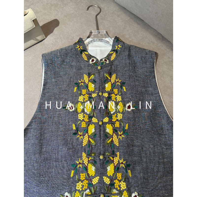 花滿林小立领正门襟盘扣重工刺绣定制亚麻马夹257585