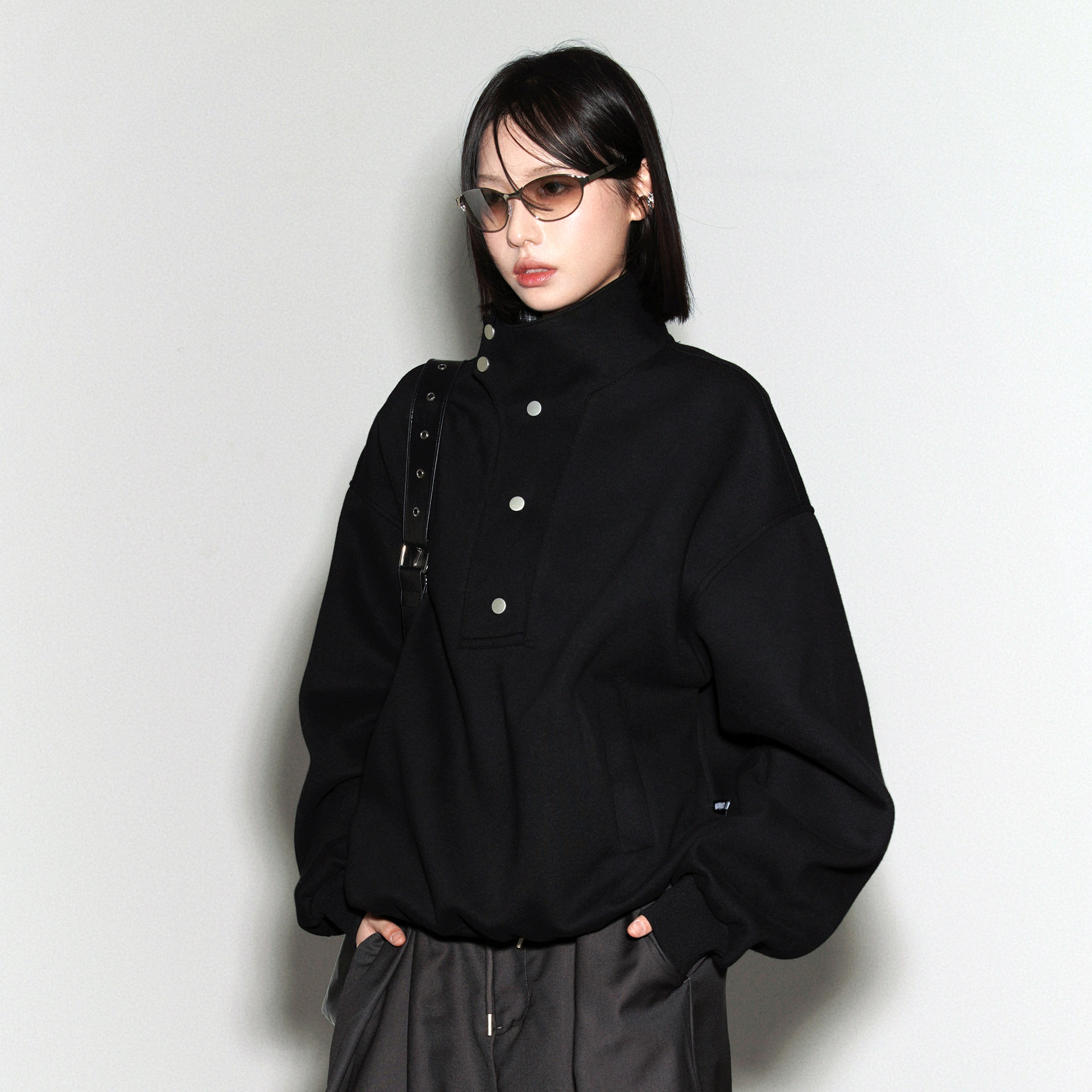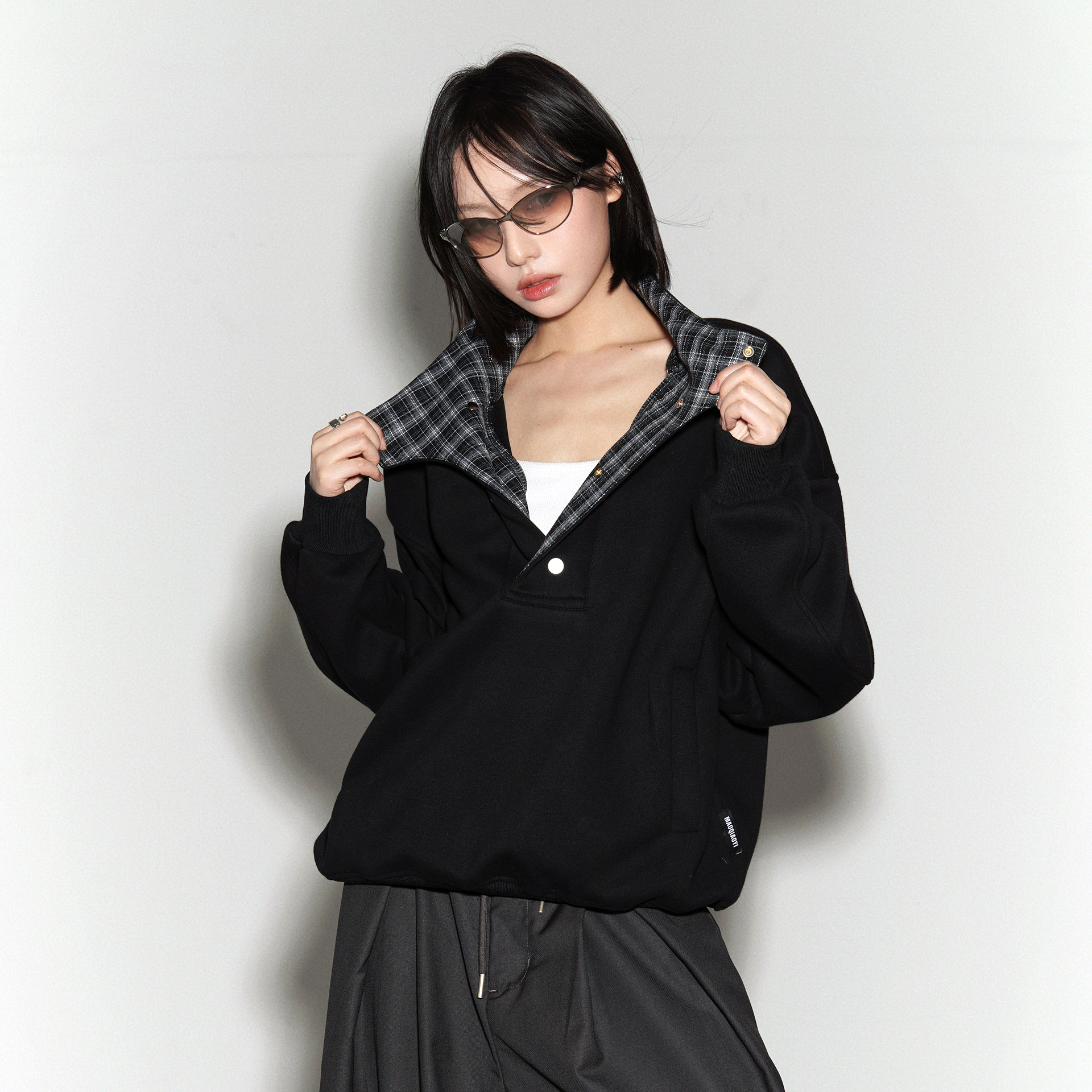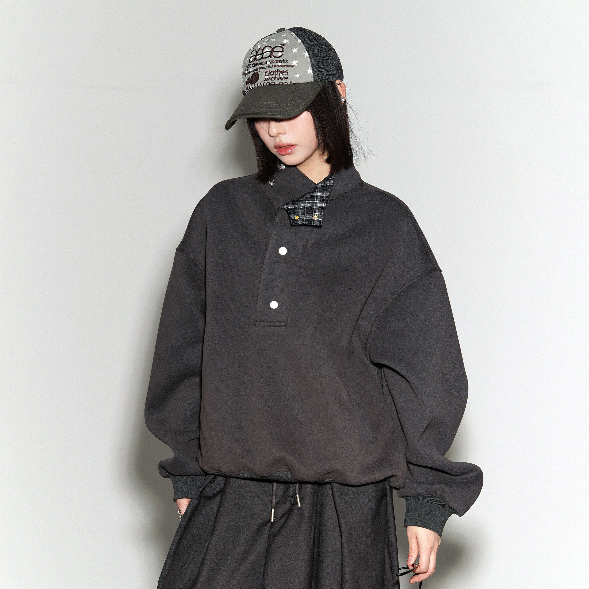 万有引力博物馆格子拼接半开领卫衣女春季 中性风宽松上衣 2026新款