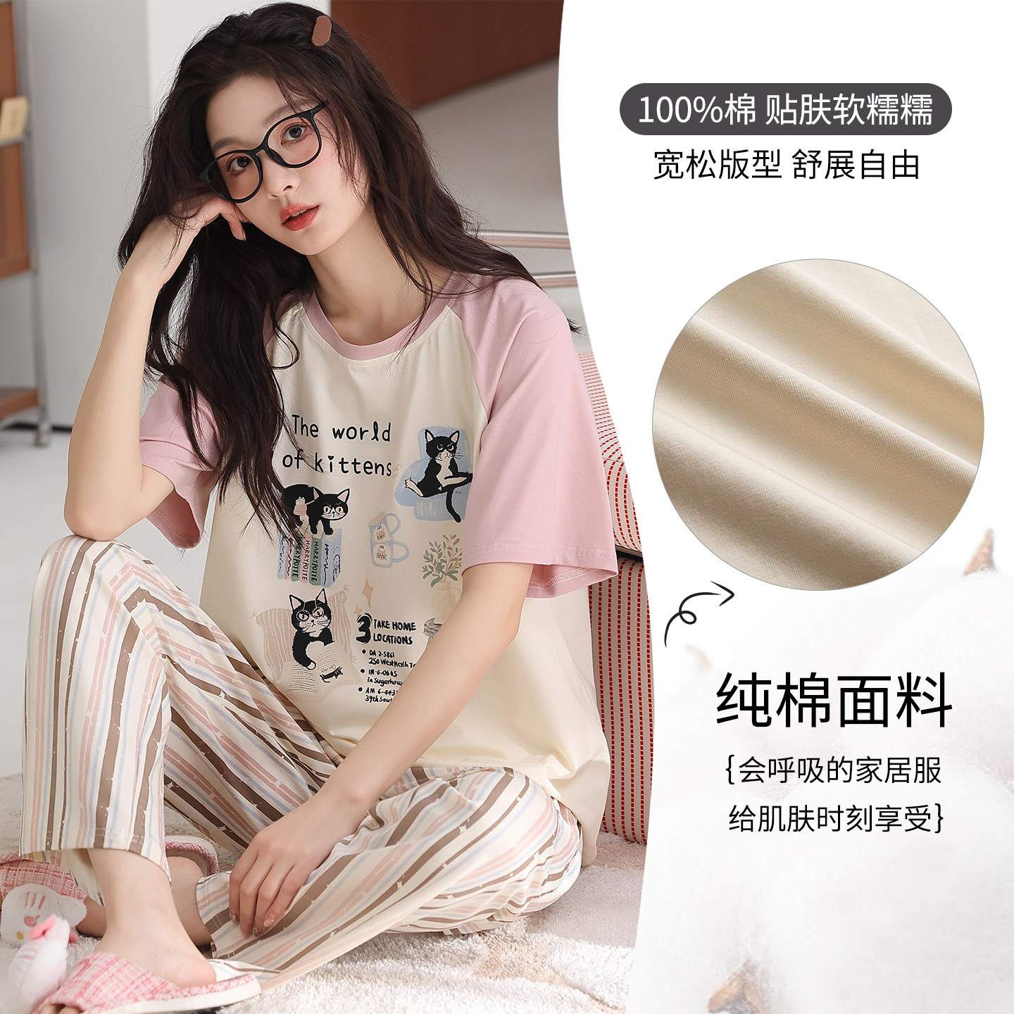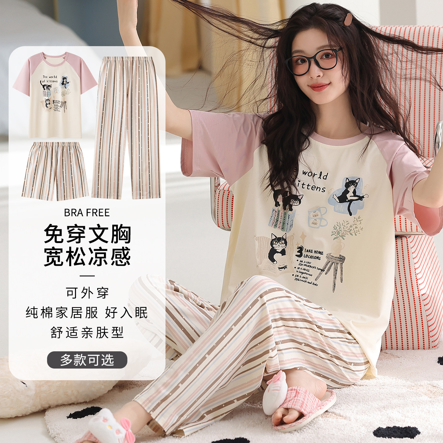 2026新款 长裤 夏季 三件套短裤 家居服 纯棉带胸垫短袖 卡之恋睡衣女款
