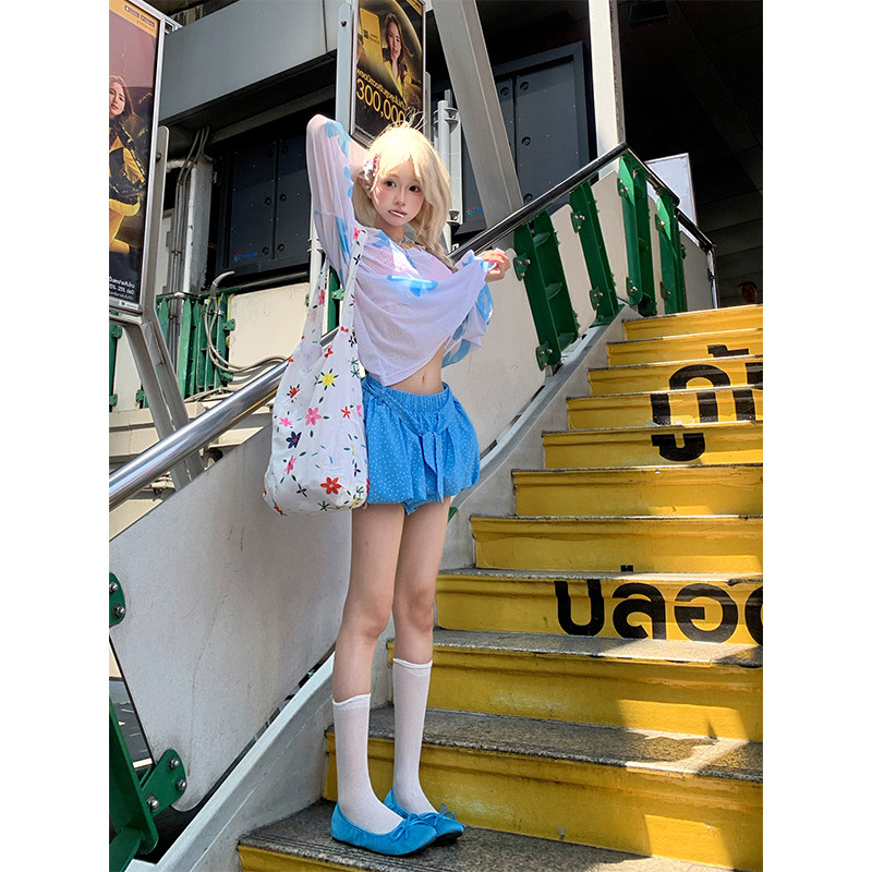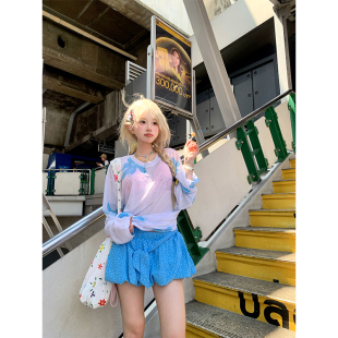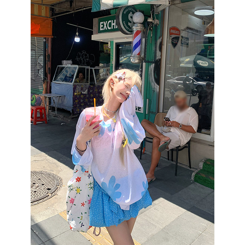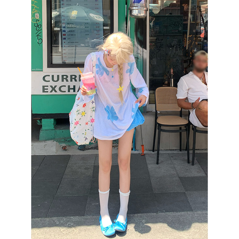 宽松显瘦百搭防晒罩衫 JMJ T恤女辣妹夏季 花卉印花长袖 上衣 美式