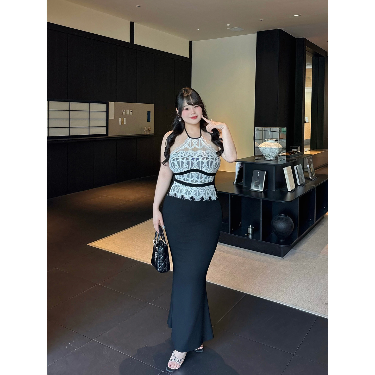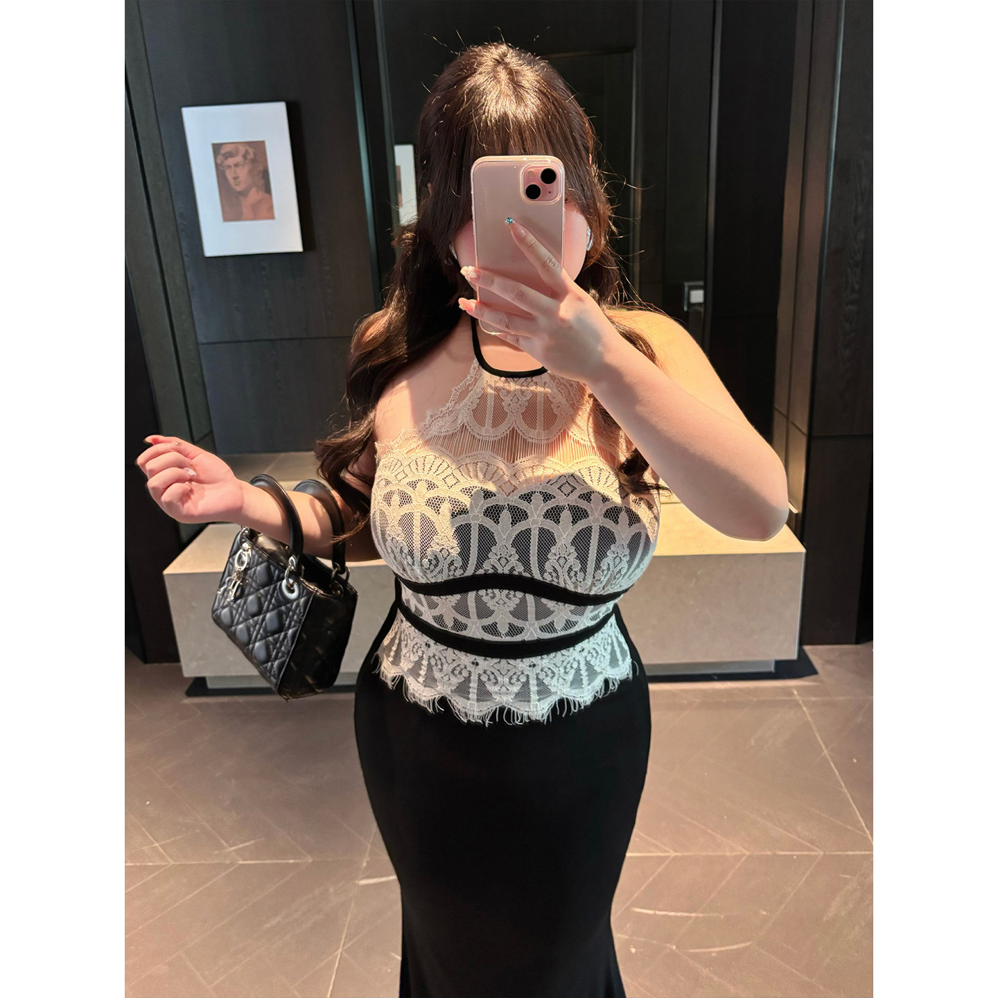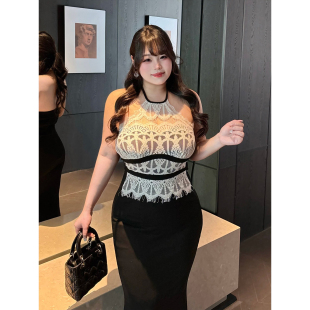 大码 娇欲妲己 微胖挂脖吊带连衣裙显瘦蕾丝拼接包臀裙 babes