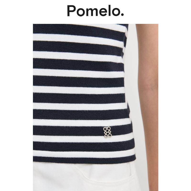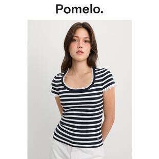 显瘦甜辣上衣女 修身 Pomelo 黑白条纹针织T恤蕾丝方领短袖