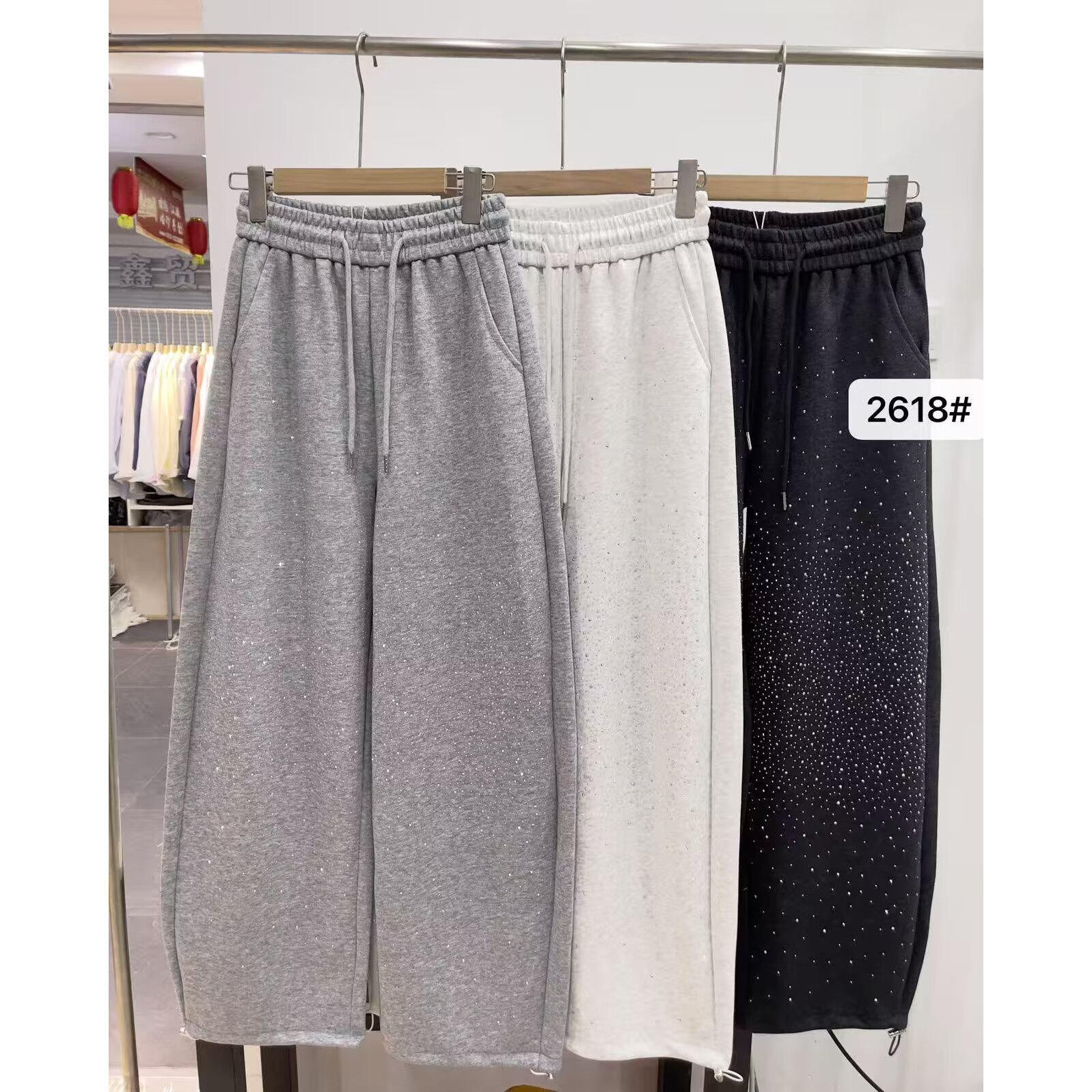 松紧腰抽绳烫钻阔腿直筒弯刀裤 女春秋休闲宽松百搭显瘦 卫裤