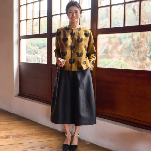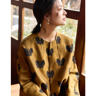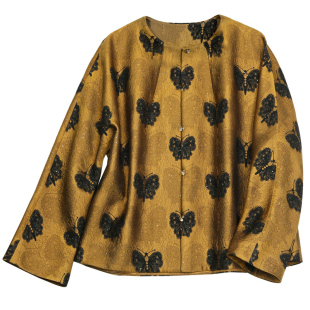 菲伊唐春装 外套女 上久楷54欧米丝毛亮片绸金色黑蝴蝶圆领开襟长袖