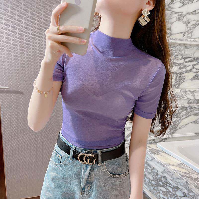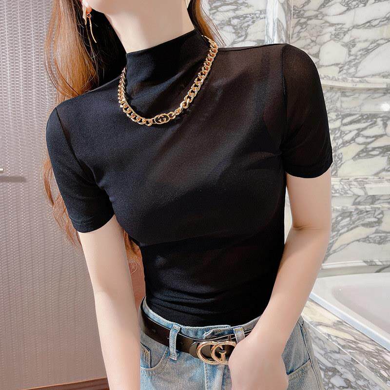 春夏白色短袖 0310z T恤女内搭网纱上衣薄纱衣配吊带裙蕾丝打底衫